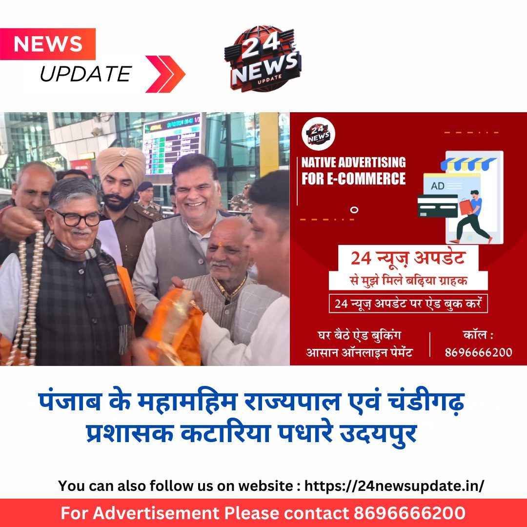 24 न्यूज अपडेट.उदयपुर। चंडीगढ़ के प्रशासक एवं पंजाब के महामहिम राज्यपाल श्री गुलाबचंद कटारिया का आज एक दिवसीय प्रवास पर अपने गृहनगर पहुंचे जहां एयरपोर्ट पर प्रशासन द्वारा उन्हें गार्ड ऑफ ऑनर दिया गया।तत्पश्चात भाजपा जिलाध्यक्ष रवींद्र श्रीमाली एवं शहर विधायक ताराचंद जैन के सानिध्य में कार्यकर्ताओं पदाधिकारियों ने उनका स्वागत किया।