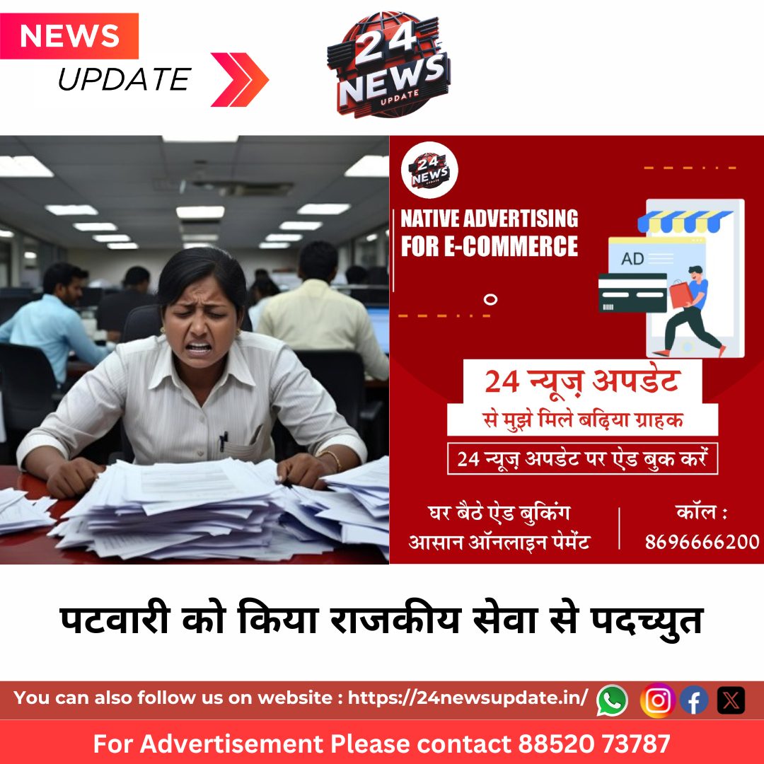 24 न्यूज अपडेट, श्रीगंगानगर। पटवारी सुभाष चन्द्र चालिया निवासी बीकानेर तत्कालीन पटवार मंडल कुचौर अगुणी अतिरिक्त प्रभार कुचौर आथुणी तहसील नोखा बीकानेर व वर्तमान पदस्थापन 40 पीएस तहसील रायसिंहनगर जिला गंगानगर को 28 अप्रैल 2025 को राज्य सेवा से पदच्युत (डिसमिस) कर दिया गया है।