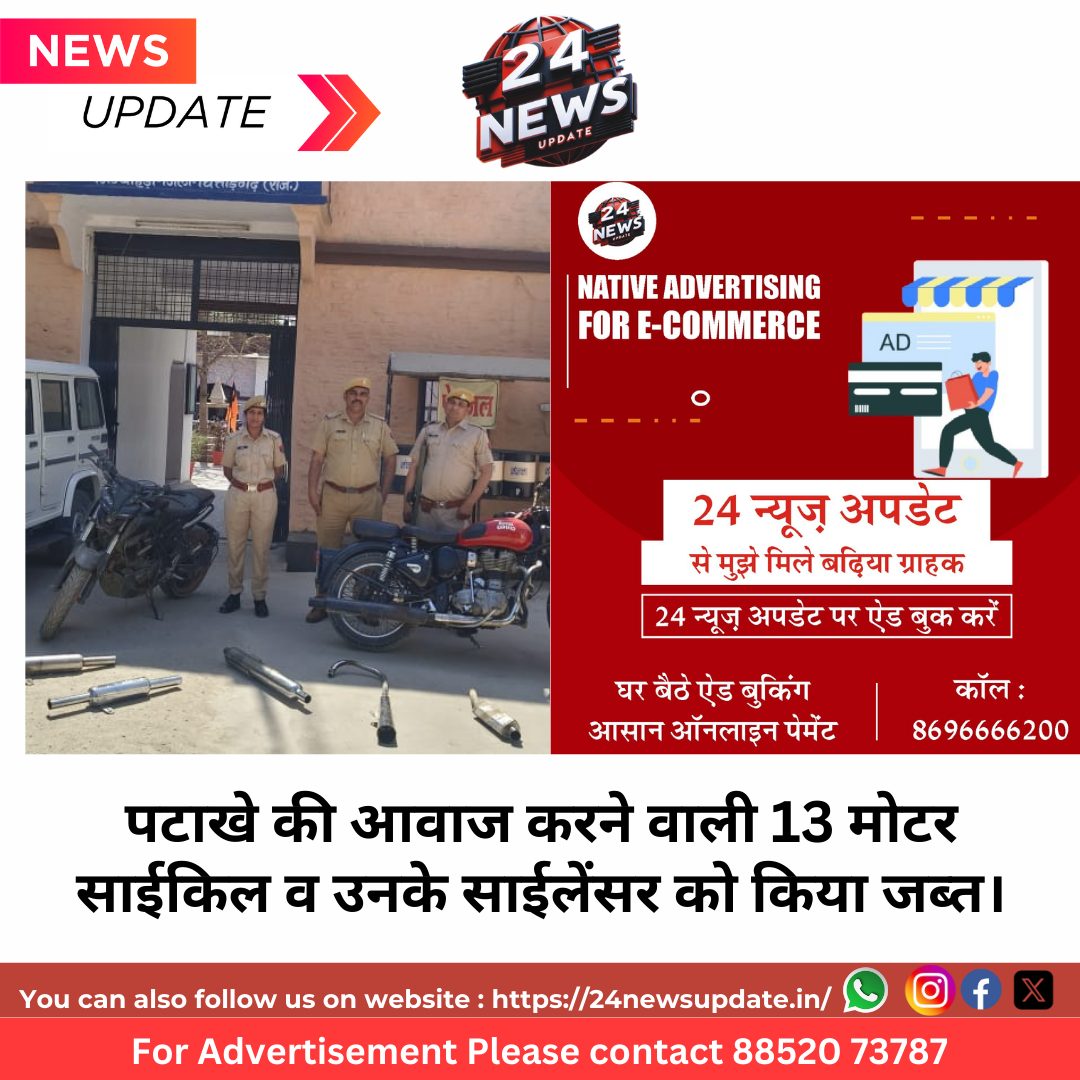 24 news update निम्बाहेडा। कोतवाली निम्बाहेडा पुलिस द्वारा पटाखे की आवाज करने वाली मोटर साईकिल व उनके मोडिफाइड साईलेंसर को जब्त किया गया है। पुलिस द्वारा बीते दस दिनों में मोडिफाइड साइलेंसर लगी 13 मोटर साईकिल को जब्त किया है। पुलिस अधीक्षक सुधीर जो-रु39या ने बताया निम्बाहेड़ा कस्बे में पिछले कुछ समय से ि-रु39याकायत मिल रही थी की साइलेंट जोन में बाइक सवार बाइक से पटाखे का -रु39यार निकाल कर परे-रु39यान करते हैं। ये लोग रात-ंउचयदिन इलाके में घूमकर बाइक से -रु39यार करते हैं। सूचना मिलने पर पुलिस टीमों को नाकाबंदी व ग-रु39यत के दौरान इस प्रकार की वि-रु39यो-ुनवजया बाइक पर ध्यान देने के निर्दे-रु39या दिए। डीएसपी निम्बाहेड़ा बद्रीलाल राव के सुपरविजन व थानाधिकारी कोतवाली निम्बाहेड़ा रामसुमेर मीणा के निर्दे-रु39या पर थाने के एएसआई सूरज कुमार, कानि. ज्ञानप्रका-रु39या, -रु39या-रु39यापाल व देवेंद्र द्वारा कस्बा निम्बाहेडा मे सजगता से ग-रु39यत कर पुलिस द्वारा पिछले 10 दिनों में 13 पटाखा मोटरसाइकिलों को जब्त कर साइलेंसर जब्त किए गए एवं 27 मोटरसाइकिल जिनके आगे पीछे नंबर नहीं लिखे हुए थे, उनको जब्त करके चालान बनाए गए। जिसमें -रु39यानिवार की रात्रि को ही 07 मोटर साइकिल जब्त की और उनके साइलेंसरों को जप्त किया जाकर आव-रु39ययक चालान की कार्यवाही की गई। नाबालिक बच्चों के पेरेंट्स के खिलाफ कार्रवाई की जाएगी और रजिस्ट्रे-रु39यान रद्द करवाया जाएगा।