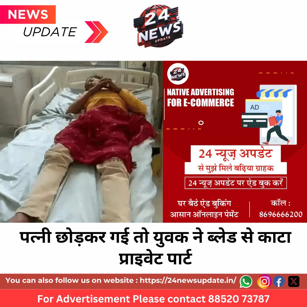 24 News Update भीलवाड़ा। राजस्थान के भीलवाड़ा जिले में एक युवक ने पत्नी के बार-बार बुलाने पर भी वापस न आने से आहत होकर आत्मघाती कदम उठा लिया। युवक ने ब्लेड से अपने प्राइवेट पार्ट पर वार कर लिया। गंभीर रूप से घायल अवस्था में परिजन उसे तत्काल महात्मा गांधी अस्पताल (भीलवाड़ा) लेकर पहुंचे, जहां से प्राथमिक उपचार के बाद उसे उदयपुर हायर सेंटर रेफर कर दिया गया। यह दर्दनाक घटना जिले के आसींद थाना क्षेत्र के झालरिया गांव में शुक्रवार दोपहर करीब 2 बजे हुई।