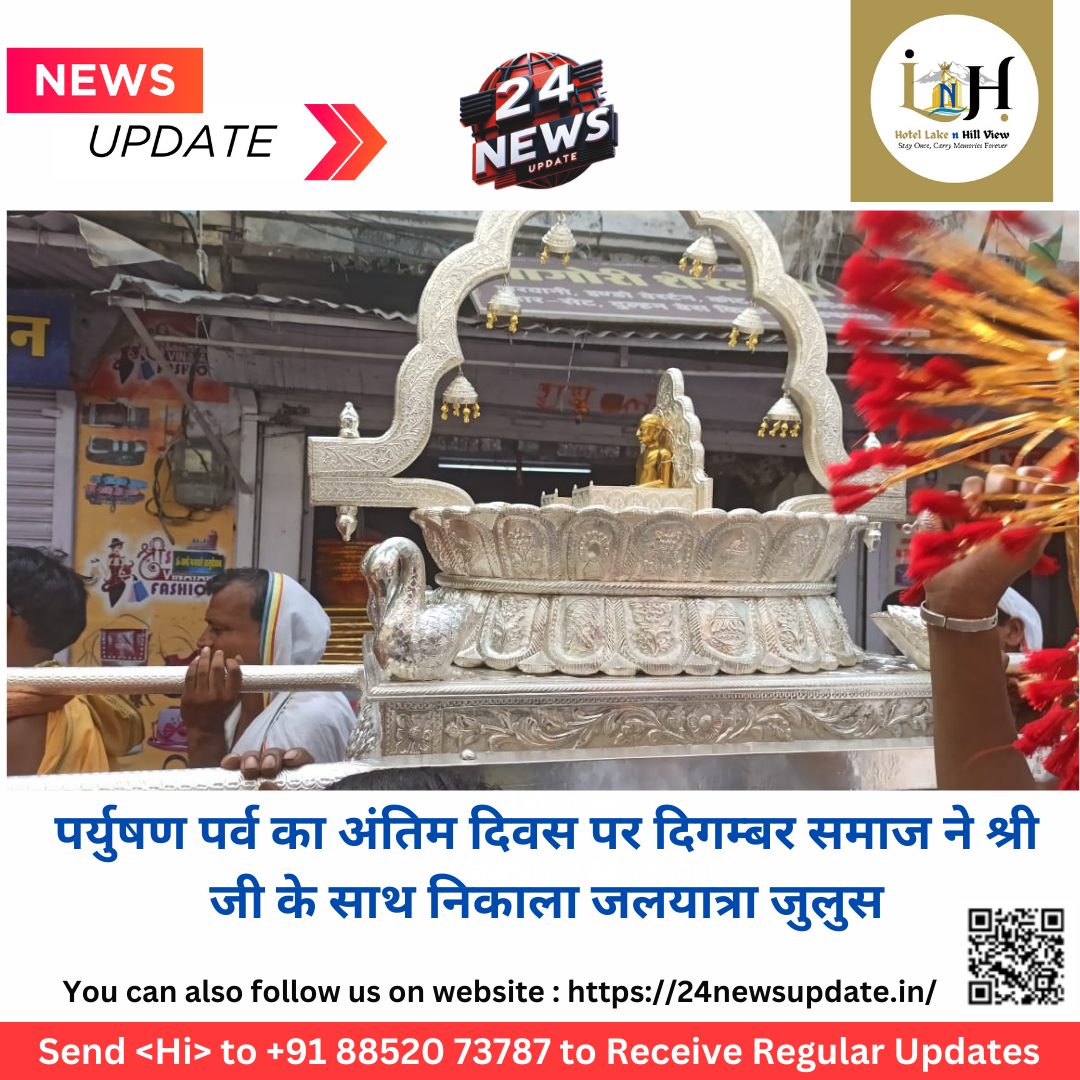 निम्बाहेड़ा। नगर मे मंगलवार को सकल दिगंबर जैन समाज ने दशलक्षण पर्व के अंतिम दिवस अनंत चतुर्दशी का श्रीजी सँग जलयात्रा जुलुस निकाला वहीं पर्युषण पर्व का समापन बुधवार को उत्तम क्षमायाचना पर्व मनाकर किया जाएगा।