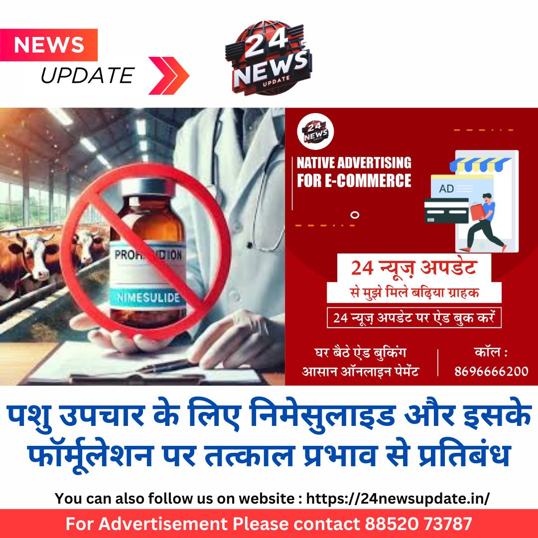24 न्यूज अपडेट. जयपुर। केंद्र सरकार ने एक अधिसूचना जारी कर पशु उपचार के लिए निमेसुलाइड और इसके फॉर्मूलेशन पर तत्काल प्रभाव से प्रतिबंध लगा दिया है। अधिसूचना के अनुसार निमेसुलाइड युक्त औषधि फॉर्मूलेशन के उपयोग से पशुओं को खतरा होने की संभावना है। इसलिए निमेसुलाइड के सभी फॉर्मूलेशन के निर्माण, बिक्री और वितरण को प्रतिबंधित करना सार्वजनिक हित में आवश्यक और समीचीन है। इन औषधियों के सुरक्षित विकल्प भी उपलब्ध हैं, अतः इसके स्थान पर अन्य विकल्पों का उपयोग किया जाना चाहिए।