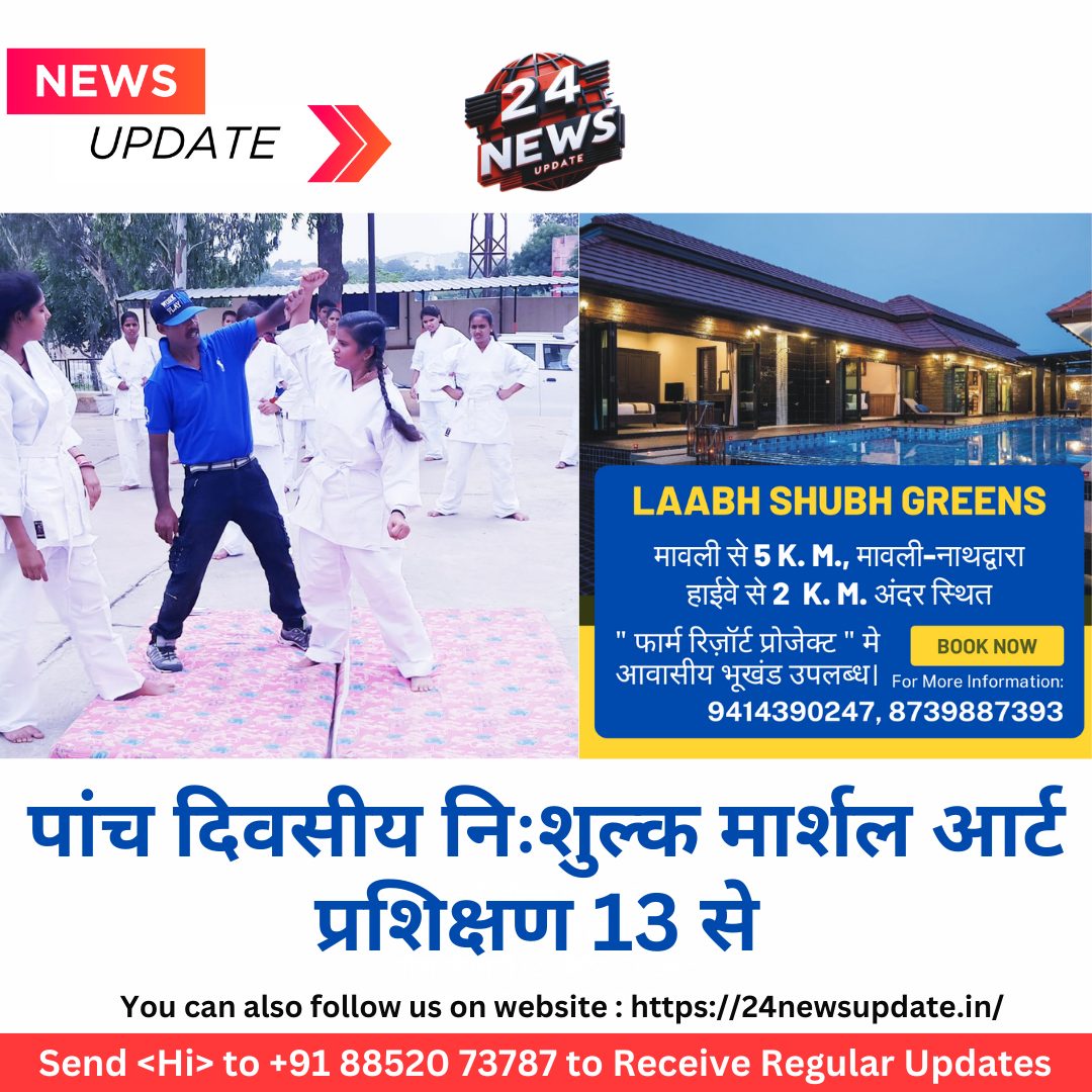 24 न्यूज अपडेट. उदयपुर। कमांडो मार्शल आर्ट एंड फिटनेस अकैडमी उदयपुर की ओर से 13 नवंबर से पांच दिवसीय निःशुल्क मार्शल आर्ट , नियुद्ध कला का प्रशिक्षण , भारतीय संस्कृति से संबंधित विशेष नियुद्ध कला कौशल का प्रशिक्षण दिया जाएगा। इस पांच दिवसीय निःशुल्क प्रिक्षण में विशेष आत्मरक्षा की तकनीक एवं मार्शल आर्ट का विशेष प्रशिक्षण दिया जाएगां शाम को 6 से 8 बजे तक ऋषभ प्लाजा सेक्टर 4 उदयपुर पर यह प्रशिक्षण दिया जाएगा। विशेष मार्शल आर्ट प्रशिक्षण शिविर में अधिकतम प्रतिभागियों की संख्या 200 तक रहेगी। इस पांच दिवसीय निःशुल्क आत्मरक्षा एवं मार्शल आर्ट प्रशिक्षण शिविर का समापन समारोह 17 नवंबर को होगा। शिक्षण के समाप्ति पर विशेष प्रशिक्षण प्राप्त करने वाले प्रतिभागियों को पुरस्कार निमित्त पारितोषित दिया जाएगा । निःशुल्क प्रशिक्षण में भाग लेने के लिए अपना रजिस्ट्रेशन करवाना होगा। इसके लिए कमांडो मार्शल आर्ट एंड फिटनेस अकैडमी , ऋषभ प्लाजा हिरण मगरी सेक्टर 4 उदयपुर में होगा।