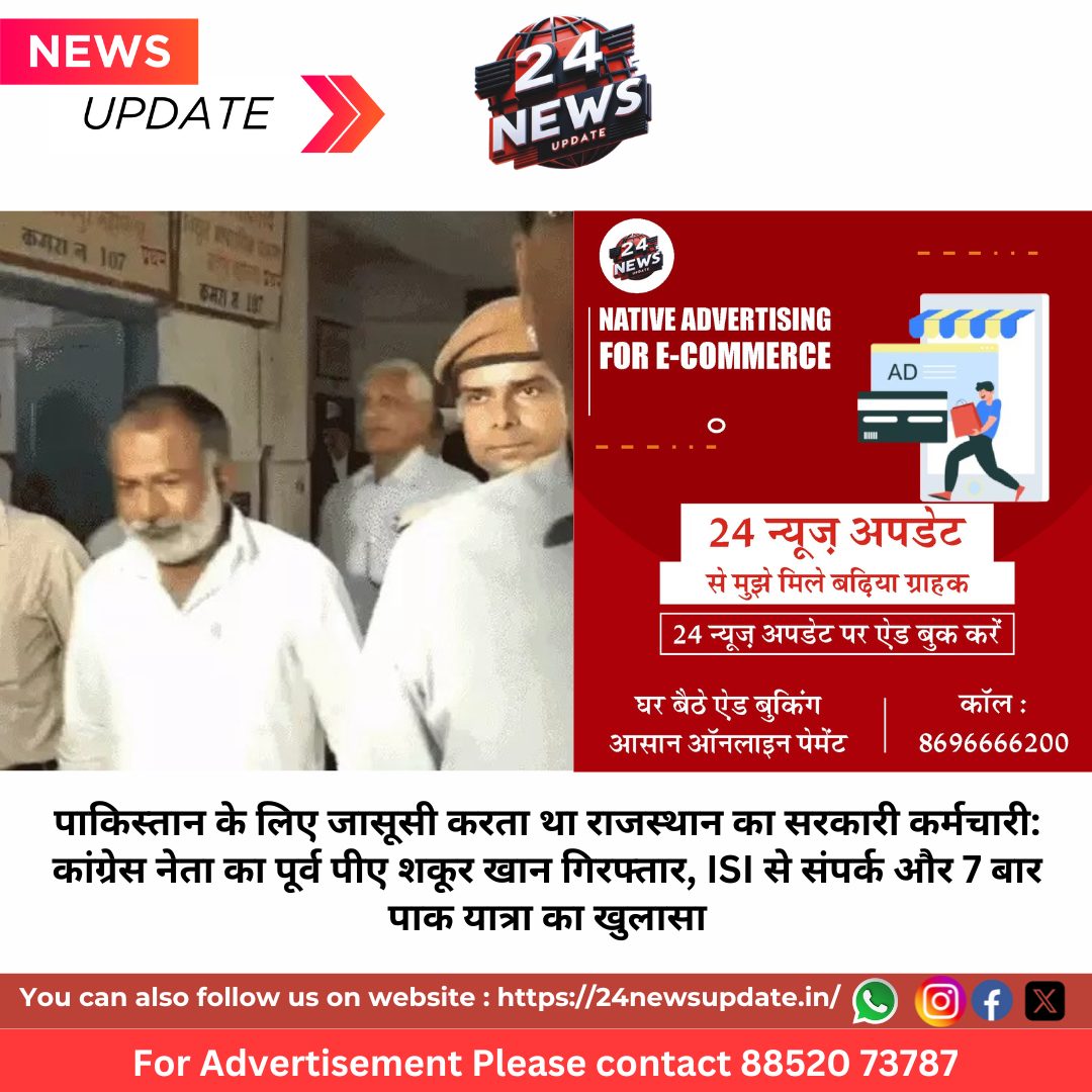24 News Update जयपुर | राजस्थान के जैसलमेर जिले से एक चौंकाने वाला जासूसी प्रकरण सामने आया है। राजस्थान इंटेलिजेंस की कार्रवाई में पकड़ा गया सरकारी कर्मचारी शकूर खान पिछले 15 वर्षों में सात बार पाकिस्तान की यात्रा कर चुका था और लगभग 60 दिनों तक वहां रह चुका है। सूत्रों के अनुसार, वह पाकिस्तान की खुफिया एजेंसी ISI से सीधे संपर्क में था और वॉट्सऐप के माध्यम से संवेदनशील जानकारियाँ, लोकेशन और नाम भेजता था।