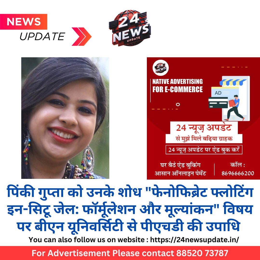 24 न्यूज़ अपडेट उदयपुर 31 दिसम्बर। बीएन यूनिवर्सिटी, उदयपुर से पिंकी गुप्ता को उनके शोध “फेनोफिब्रेट के फ्लोटिंग इन-सिटू जेल का फॉर्मूलेशन और मूल्यांकन” पर पीएचडी की उपाधि मिली है। डॉ. कमल सिंह राठौड़ के मार्गदर्शन में, पिंकी के शोध ने फेनोफिब्रेट, एक व्यापक रूप से उपयोग किए जाने वाले एंटिलिपेमिक एजेंट के फ्लोटिंग इन-सिटू जेल फॉर्मूलेशन को विकसित करने पर केंद्रित किया। इस अध्ययन का उद्देश्य फेनोफिब्रेट की जैवउपलब्धता और चिकित्सीय प्रभावशीलता में सुधार करना था जो एक सतत-रिलीज़ खुराक रूप को डिज़ाइन करके जो पेट के तरल पदार्थ पर तैर सकता है और नियंत्रित तरीके से दवा को छोड़ सकता है। पिंकी के शोध में विभिन्न पॉलिमर, सॉल्वेंट और एडिटिव्स का उपयोग करके फेनोफिब्रेट के विभिन्न फ्लोटिंग इन-सिटू जेल फॉर्मूलेशन का फॉर्मूलेशन और मूल्यांकन शामिल था। अनुकूलित फॉर्मूलेशन को उसके भौतिक-रासायनिक गुणों, इन विट्रो ड्रग रिलीज़ और इन विवो फार्माकोकाइनेटिक प्रदर्शन के लिए चारित्रिक किया गया था। पिंकी के अध्ययन के परिणामों ने फेनोफिब्रेट की जैवउपलब्धता और चिकित्सीय प्रभावशीलता में सुधार करने में फ्लोटिंग इन-सिटू जेल फॉर्मूलेशन की क्षमता को प्रदर्शित किया। अनुकूलित फॉर्मूलेशन ने दवा के रिलीज़ और अवशोषण में महत्वपूर्ण सुधार दिखाया, जिससे यह हाइपरलिपिडेमिया के उपचार के लिए एक आशाजनक दवा प्रणाली बन गया। पिंकी के पर्यवेक्षक, डॉ. कमल सिंह राठौड़ ने उनके शोध की प्रशंसा की, कहा, “पिंकी का काम फार्मास्यूटिकल अनुसंधान के क्षेत्र में एक महत्वपूर्ण योगदान है। उनके समर्पण और दृढ़ संकल्प ने फेनोफिब्रेट के एक नए फॉर्मूलेशन को विकसित करने में मदद की है जो हाइपरलिपिडेमिया से पीड़ित रोगियों के उपचार में सुधार कर सकता है।”