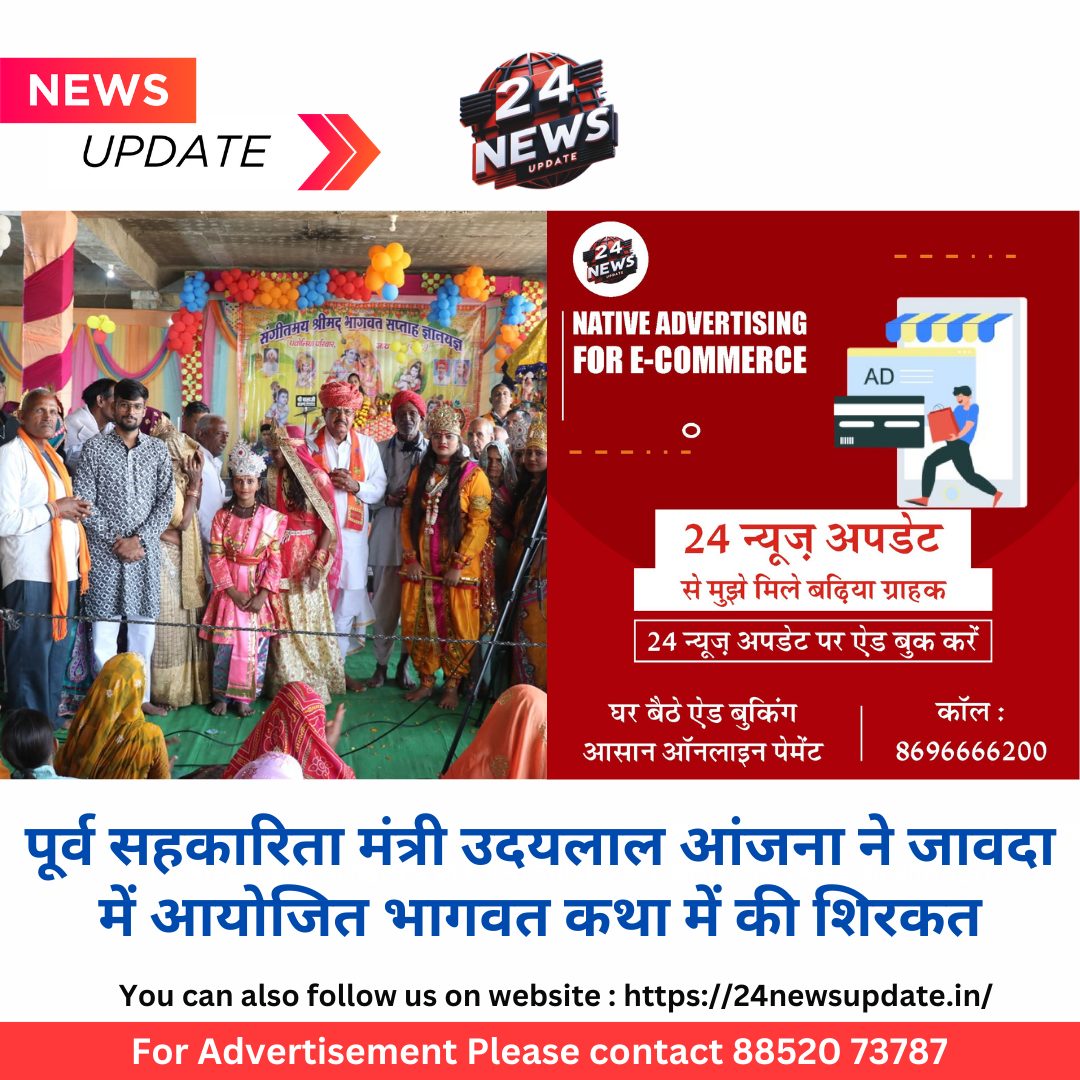 कविता पारख 24 न्यूज़ अपडेट निंबाहेड़ा । निंबाहेड़ा में यहां निकटवर्ती ग्राम पंचायत मुख्यालय जावदा में स्वर्गीय श्री कनीरामजी एवं धर्मपत्नी स्वर्गीय श्रीमती बदामी बाई जी की पुण्य स्मृति एवं गोपाल धर्मपत्नी प्रेम की नौकरी लगने के उपलक्ष्य में आयोजित सप्त दिवसीय संगीतमय श्रीमद् भागवत कथा का आयोजन शोभालाल श्रीमती गुड़ीबाई धनोलिया एवम् समस्त ग्रामवासीयों द्वारा दिनांक 16 दिसंबर से 22 दिसंबर तक किया जा रहा है।यहां ग्राम जावदा में आयोजित सप्त दिवसीय संगीतमय श्रीमद् भागवत कथा के छठे दिन राजस्थान सरकार के पूर्व सहकारिता मंत्री उदयलाल आंजना ने शिरकत कर धर्म लाभ प्राप्त किया। भागवत कथा के छठे दिन शनिवार को कथा वाचक सुश्री पूजा जी मेनारिया द्वारा की जा रही भागवत कथा में रूक्मणी विवाह प्रसंग की विवेचना की गई।प्रारंभ में पूर्व सहकारिता मंत्री उदयलाल आंजना एवं ब्लाक कांग्रेस अध्यक्ष़, ज़िला कांग्रेस कमेटी के उपाध्यक्ष एवम महासचिव व फ़लवा सरपंच के कथा स्थल पहुंचने पर आयोजन समिति के पदाधिकारियों एवम् ग्राम वासियों द्वारा ऊपर्णा ओढ़ाकर एवं साफा बंधवाकर आत्मीय स्वागत अभिनंदन किया गया।पुर्व सहकारिता मंत्री उदयलाल आंजना ने श्रीमद् भागवत कथा के आयोजन पर जावदा के शोभालाल श्रीमती गुड़ीबाई धनोलिया एवम् समस्त ग्रामवासीयों को धन्यवाद दिया। इस अवसर पर कैलाश धाकड़, किशन लाल धाकड़,सहित बड़ी संख्या में ग्रामवासी तथा कथा सुनने आए क्षैत्र के प्रबुद्धजन,गणमान्यन तथा भागवत प्रेमी इत्यादि उपस्थित थे। Share this: Share on X (Opens in new window) X Share on Facebook (Opens in new window) Facebook More Email a link to a friend (Opens in new window) Email Share on WhatsApp (Opens in new window) WhatsApp Like this:Like Loading... Related Discover more from 24 News Update Subscribe to get the latest posts sent to your email. Type your email… Subscribe Post navigation 901 सामुहिक एकासन के साथ हुई ग्रैंड समर्पणा दिवस की शुरूआत, आचार्य श्री रामेश के 50 वे दिक्षा महोत्सव पर अब 50 दिनो तक होगें विभिन्न धार्मिक आयोजन राज्य स्तरीय शैक्षिक सम्मेलन को लेकर मंडलाचारण पीईईओ के शिक्षकों की बैठक