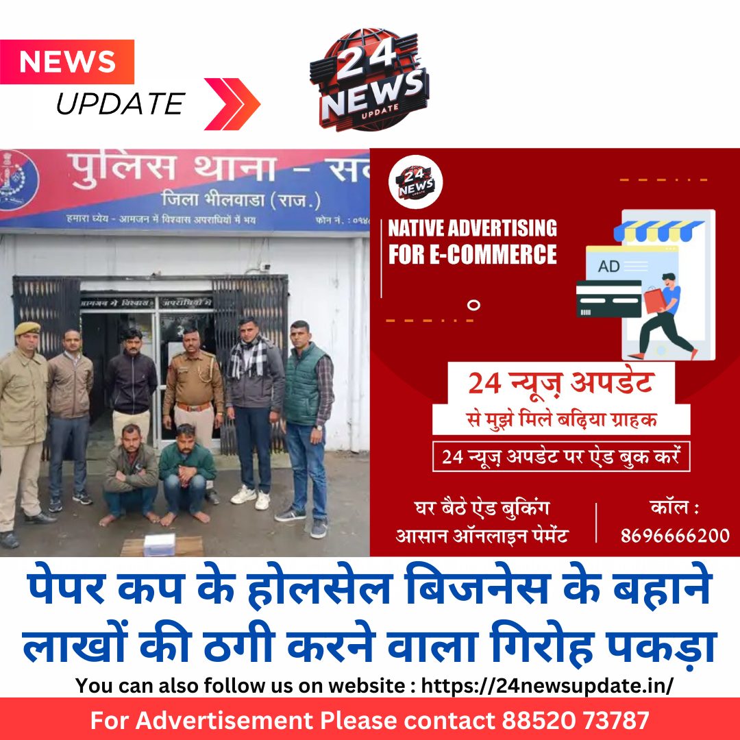 24 न्यूज अपडेट. भीलवाड़ा। पेपर कप बिजनेस के नाम पर लोगों से लाखों की ऑनलाइन ठगी करने वाला एक गिरोह पकडा गया है। पुलिसने दो आरोपियों को गिरफ्तार किया है। ये लोग फेसबुक सहित अन्य सोशल मीडिया वेबसाइट पर होलसेल रेट पर डिस्पोजल पेपर कप बेचने का लोगों को झांसा देते व उनसे ऑर्डर मंगवाते। उसके बाद लाखों रुपए की ठगी कर सिम बंद कर देते थे। पुलिस ने 2 व्यक्तियों को गिरफ्तार किया है। दोनों के खिलाफ प्रतिबिंब पोर्टल पर शिकायत की गई थी जिसके बाद पुलिस ने यह कार्रवाई की। पुलिस ने बताया कि इनसे 7 मोबाइल और 4 सिम कार्ड बरामद किए गए। पूछताछ में पश्चिम बंगाल, बिहार सहित अन्य राज्यों से पीडितों से लाखों रुपए की ठगी करना स्वीकारा है। पुलिस ने काशी विहार कॉलोनी मकान नंबर 42 पर दबिश दी। राजवीर सिंह व नरेन्द्र सिंह से 7 मोबाइल फोन व 4 सिम कार्ड बरामद किए गए। राजवीर सिंह पिता भवानी सिंह खंगारोत (30)निवासी भीलवाड़ा नरेंद्र सिंह पिता भगवान सिंह शाखावत (30) निवासी भीलवाड़ा को गिरफ्तार किया है। दोनों फेसबुक पर पोस्ट एवं स्टोरी डालते थे व हॉलसेल रेट पर डिस्पोजल पेपर कप कम कीमत में उपलब्ध होने का झांसा देते थे। इन्होंने फर्जी डॉक्यूमेंट से मोबाइल सिम ले ली व उसका इस्तेमाल कर रहे थे। अब तक ये पश्चिम बंगाल, बिहार सहित अन्य राज्यों से पीड़ितों से लाखों रुपए की ठगी कर चुके हैं।
