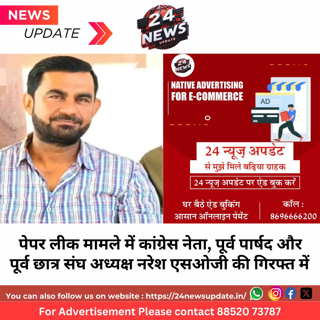 24 न्यूज अपडेट, बाड़मेर। राजस्थान में वनरक्षक भर्ती परीक्षा 2020 के पेपर लीक मामले में एसओजी ने एक बड़ी कार्रवाई करते हुए कांग्रेस नेता, पूर्व पार्षद और पूर्व छात्र संघ अध्यक्ष नरेश देव सहारण को हिरासत में लिया है। पुलिस ने बाड़मेर में उनके घर पर छापा मारकर उन्हें पकड़ा। एसओजी की टीम नरेश देव सहारण की पेपर लीक में भूमिका की जांच कर रही है। नरेश देव सहारण को पूछताछ के लिए जयपुर ले जाया गया है।