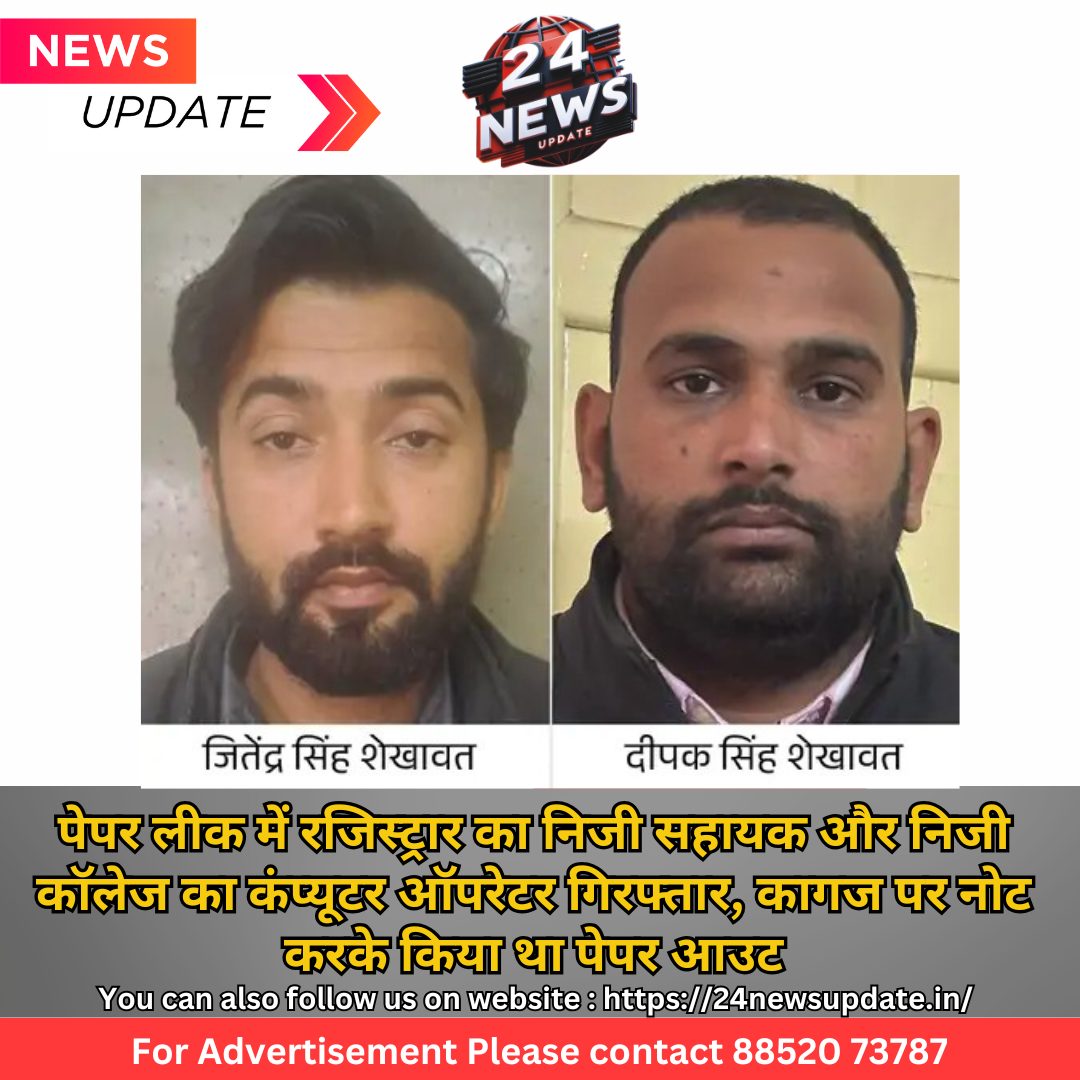 24 न्यूज अपडेट. जयपुर। राजस्थान स्वास्थ्य विज्ञान विश्वविद्यालय की नर्सिंग सेमेस्टर इंटरनल परीक्षा में पेपर लीक होने की घटना ने राज्य के शिक्षा क्षेत्र में हड़कंप मचा दिया है। जयपुर कमिश्नरेट की साइबर थाना पुलिस ने इस गंभीर मामले का पर्दाफाश करते हुए दो आरोपियों को गिरफ्तार किया है। इसमें एक विश्वविद्यालय के परीक्षा अनुभाग में सहायक रजिस्ट्रार का निजी सहायक और दूसरा जयपुर के पिंक सिटी कॉलेज ऑफ नर्सिंग का कंप्यूटर ऑपरेटर शामिल है।