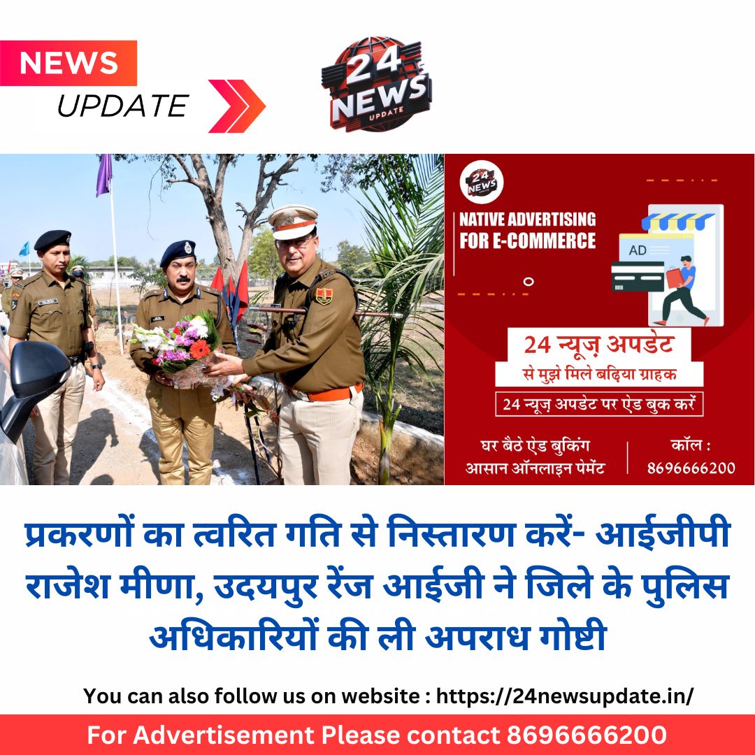 24 न्यूज अपडेट चित्तौड़गढ़। बुधवार को उदयपुर रेंज के पुलिस महानिरीक्षक श्री राजेश मीना ने पुलिस लाईन में पुलिस अधीक्षक, एएसपी, डीएसपी सहित जिले के सभी पुलिस अधिकारियों की अपराध गोष्ठी ली। पेंडिंग प्रकरणों का शीघ्र निस्तारण करने, विभिन्न मामलों में वांछित अपराधियों की धरपकड़ करने, मालखाने का अधिकाधिक निस्तारण करने व आगामी समय मे कानून व्यवस्था संबंधी चर्चा की। आईजीपी श्री राजेश मीना के पुलिस लाईन पहुंचने पर एसपी श्री सुधीर जोशी ने स्वागत किया, सम्मान गार्ड द्वारा सलामी दी गई। आईजीपी ने जिले के सभी पुलिस अधिकारियों से परिचय प्राप्त किया व उनके कार्य क्षेत्र व अपराध की जानकारी ली।