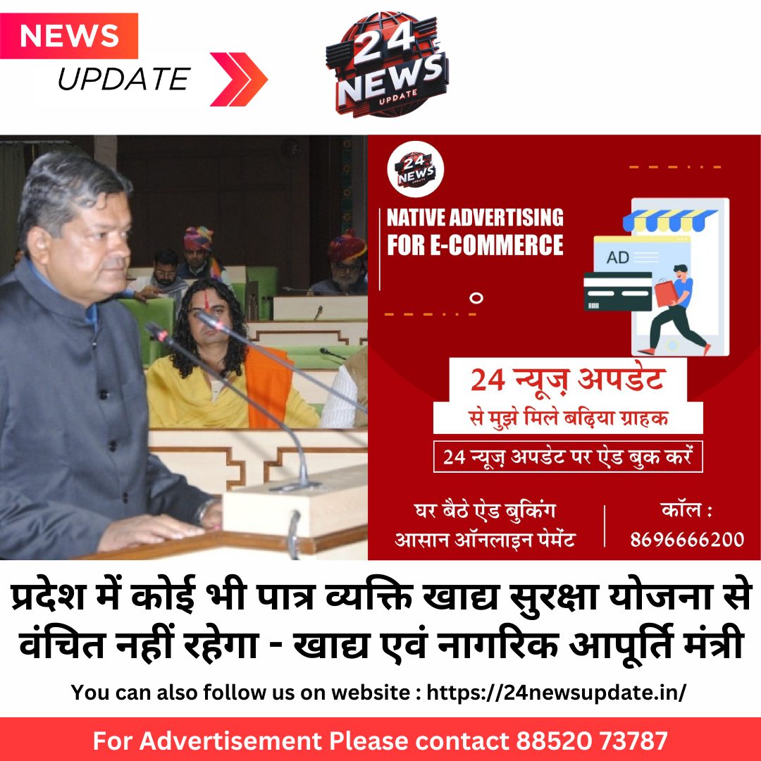 24 न्यूज अपडेट जयपुर। खाद्य एवं नागरिक आपूर्ति मंत्री सुमित गोदारा ने कहा कि खाद्य सुरक्षा योजना का लाभ पात्र व्यक्तियों को पहुंचाने के लिए राज्य सरकार कटिबद्ध है। वंचित पात्र परिवारों का खाद्य सुरक्षा योजना में नाम जोड़ने के लिए राज्य सरकार द्वारा 26 जनवरी 2025 से पोर्टल खोला जा चुका है। इस योजना का लाभ लेने के लिए लगातार पात्र व्यक्ति ई-मित्र एवं विभागीय पोर्टल के माध्यम से आवेदन कर रहे हैं। उन्होंने कहा कि राज्य सरकार के प्रभावी प्रयासों से राजस्थान में खाद्य सुरक्षा योजना से कोई भी पात्र व्यक्ति वंचित नहीं रहेगा।