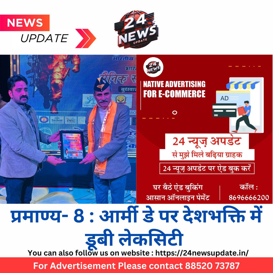 24 न्यूज़ अपडेट उदयपुर. भारत माता की जय, इंकलाब ज़िन्दाबांद सरीखे जयघोष और देशभक्ति गीतों के साथ बुधवार को आर्मी डे (सैनिक दिवस) उदयपुर में धूमधाम के साथ मनाया गया. आर्मी डे के अवसर पर हवेली परिवार की ओर से प्रमाण्य- 8 का आयोजन टाउनहॉल स्थित सभागार में मनाया गया. इस दौरान शहीदों के परिवारजनों और सेना के जवानों का सम्मान किया गया. हवेली परिवार के प्रद्युमन सिंह राठौड़ एवम संजय नागदा ने बताया कि 15 जनवरी 1952 को भारतीय आर्मी को ब्रिटिश आर्मी ने कमान सौंपी थी जिसके उपलक्ष्य में भारतीय सेना दिवस का आयोजन किया जाता है| प्रमाण्य के साथ खास यह है की यह भारतवर्ष का एकमात्र कार्यक्रम है जो शहर के आम नागरिकों द्वारा आर्मी के लिए आयोजित किया जाता है!