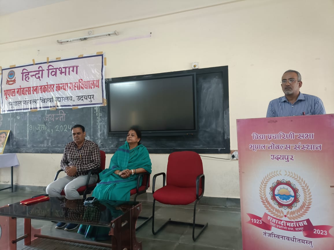 24 न्यूज अपडेट उदयपुर। भूपाल नोबल्स विश्वविद्यालय के भूपाल नोबल्स स्नातकोत्तर कन्या महाविद्यालय के हिन्दी विभाग की ओर से प्रेमचन्द जयंती की अवसर पर आयोजित परिचर्चा के मुख्य वक्ता डाॅ. ललित श्रीमाली ने प्रेमचन्द का स्मरण करते हुए उनके रचनात्मक अवदान को हिन्दी साहित्य की अनुपम निधि बताया। उन्होंने कहा कि प्रेमचन्द ने हिन्दी कथा साहित्य को आमजन के साथ जोड़ा और वे सच्चे अर्थों में मानवता के पक्षधर रचनाकार थे। उनकी कहानियां और उपन्यास साहित्य में समाज के सभी वर्गों का चित्रण देखने को मिलता है। प्रेमचन्द का साहित्य आज भी प्रासंगिक है।