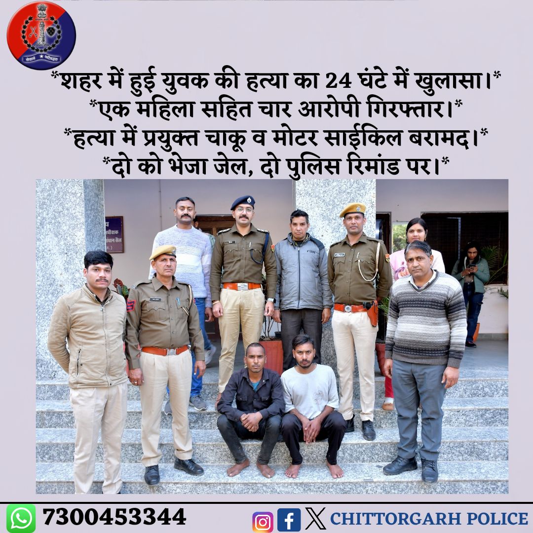 Chittorgarh, Kotwali Chittorgarh police team led by DSP Chittorgarh police team including a woman who made the incident after assault and stabbing of a youth on December 28 in the huts of Bhillo of city Chittorgarh Four accused have been arrested. Used knife and motorcycle in murder has been recovered from the accused. Two accused including the female accused have been sent into judicial custody while two accused have been kept on police remand.According to Police Superintendent Mr. Sudhir Joshi, son of Ram Pawar, Devraj Pawar, a resident of Sialia Police Police Station, in his report said that his brother Lakhan on December 28 at around 10-11 p.m. M. Around Bazaar, the huts of Bhilo reached the house of Shantibai Khatik where the girlfriend of Lakhan Chandni daughter Ravi Lot and Chandni’s mother Rekha wife Ravi Lot, who abused Lakhan about staying away from their daughter. Started punching and called her boy Vikas Lot from a rented house nearby. On whom Rekha’s son and Chandni’s brother Vikas Lot, his friend Vijay Jat’s son Dharmaveer Jat resident Gandhinagar Chitorgarh and Suraj son Mangal Bhil resident Devka village police station Bajna district Ratlam (M. P. ) Who came, with the intention of killing life, Vikas Loth took out the knife and attacked the stomach of Lakhan twice. As soon as he fell down, the sun also stabbed the knife and Line and Vijay also kicked him with bribery. Development, victory, sun ran away from the chance. Lakhan was injured, who was referred to Savariya ji hospital Chitorgarh to Udaipur for treatment where he died during treatment attack. On which the case registered and research was done by DSP Chittorgarh Vinay Chaudhary.Looking at the seriousness of the incident, police station officer Kotwali Chitorgarh Sanjeev Swami Puni under the direction of ASP Chitorgarh Sarita Singh and supervision of DSP Chitorgarh Vinay Chaudhary. A special team was formed under the leadership. In the case, accused using technical evidence and human intelligence, the huts of Bhilo, Chitorgarh resident development son Ravi Lot, Gandhinagar Chitorgarh resident Vijay Jat son Dharmaveer Jat, Devka village police station of Ratlam district of Madhya Pradesh, Suraj son of Mangal Maida and Bhilo Rekha, wife Ravi Lot, a resident of Chitorgarh, was arrested within 24 hours of the incident and presented in the court. From where accused Vijay Jat and Rekha were sent to judicial defense and accused Vikas Loth and Suraj Maida were taken on police remand, according to their information, the knife and motorcycle used in the incident were recovered. Intensive investigation is being done by the arrested accused in the case.*The team in action :-Province Officer Chittorgarh Vinay Chaudhary, Police Officer Kotwali Chittorgarh Sanjeev Swami Pu. Ni. , ASI AMBALAL, HEAD KANI. Gopal Lal, Kani. Omprakash, Harful, Rajesh and Mukesh, Head Kani of Circle Office Chittorgarh. Gautam and Kani. Kamalendra Singh.