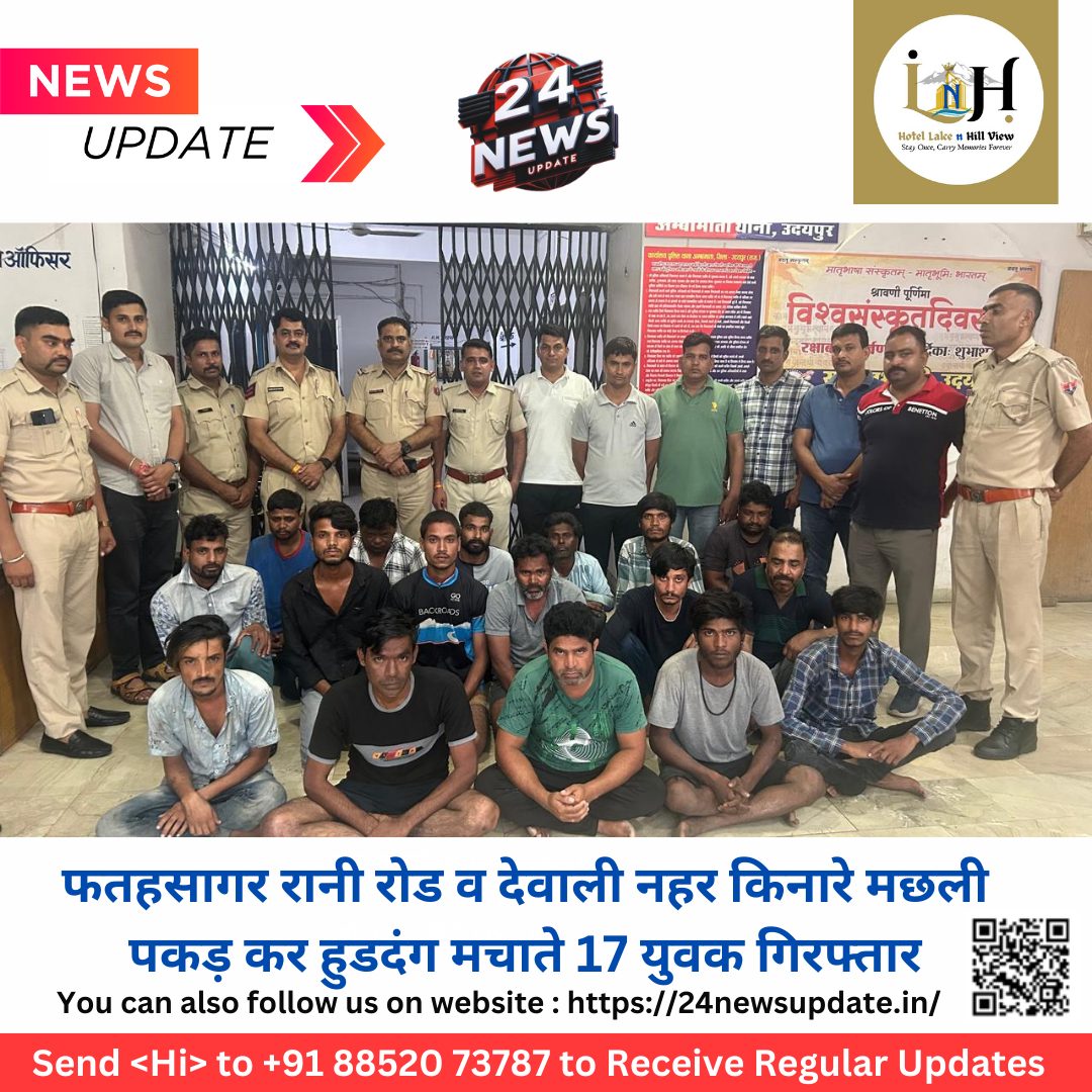 24 न्यूज अपडेट. उदयपुर। जिला पुलिस अधीक्षक योगेश गोयल, जिला पुलिस अधीक्षक उदयपुर ने बताया कि रानी रोड, देवाली नहर एवं फतहसागर झील में मछली पकड़ते समय हुडदंग मचाते लडक़ों के विरूद्व अभियान में गोपाल स्वरूप मेवाडा, अतिरिक्त पुलिस अधीक्षक मुख्यालय, उदयपुर एवं कैलाश बोरीवाल, वृताधिकारी वृत नगर पश्चिम के निर्देशन पर डॉ. हनवन्त सिंह राजपुरोहित, थानाधिकारी द्वारा विशेष टीमों का गठन कर झीलों व पर्यटक स्थलों को चेक किया गया तो रानी रोड व देवाली झील किनारे के पास झुण्ड बनाकर हो-हल्ला कर मछलियों को जाल में पकड़ डण्डे से पीट रहे थे व आम जनता द्वारा मना करने पर उनके साथ झगड़ा कर राहगीरेां को परेशान कर रहे थे जिससे संजय पार्क वाली रोड व मस्तान बाबा जाने वाली रोड पर काफी भीड़ उमड़ रही थी। यातायात बाधित हो रहा था जिनको समझाईस की मगर नहीं मानने पर कार्यवाही करते हुए 17 युवकों को शान्तिभंग के आरोप में धारा 126 – 170 ( 1 ) बीएनएसएस में गिरप्तार किया गया। आम जन से अपील- पुलिस द्वारा आमजन से अपील की जाती है कि माह अगस्त और सितम्बर में मछलियों का प्रजनन काल होने से इनको पकडऩे पर रोक रहती है अत: फतहसागर पाल, रानीरोड, देवाली तथा झीलो के आसपास के क्षेत्रो में मछली पकडना, तेज गति से वाहन चलाकर स्टंट करना, पटाखे फोडने, झील के अन्दर कचरा डालना तथा उक्त स्थानो पर बेठकर शराब पीने व ऐसा कोई कृत्य करते हुए जिससे आमजन को परेशानी का सामना करना पडे, करते पाए जाने पर आपके विरूद्व कडी कार्यवाही की जाएगी, विगत दिनों मे भी ऐसे तत्वो पर कार्यवाही कर गिरफ्तार किया गया है। कार्यवाही करने पुलिस टीम में डॉ. हनवन्त सिंह राजपुरोहित, थानाधिकारी अम्बामाता, रणजीत सिह सउनि, शिवदत सिहं सउनि, नन्दकिशोर पण्डया हैडकानि, पप्पू कुमार कानि, रामप्रसाद कानि , हिरासिंह कानि, सुरेश बिश्नोई कानि, ओमप्रकाश कानि, महेन्द्र चौधरी कानि, निलेश कानि, जगदीश कानि, शक्ति सिह कानि आसूचना, चेतनदास कानि, जगदीश मीणा कानि, राजकमल कानि, घनश्याम कानि चालक, इमरान कानि चालक शामिल थे।