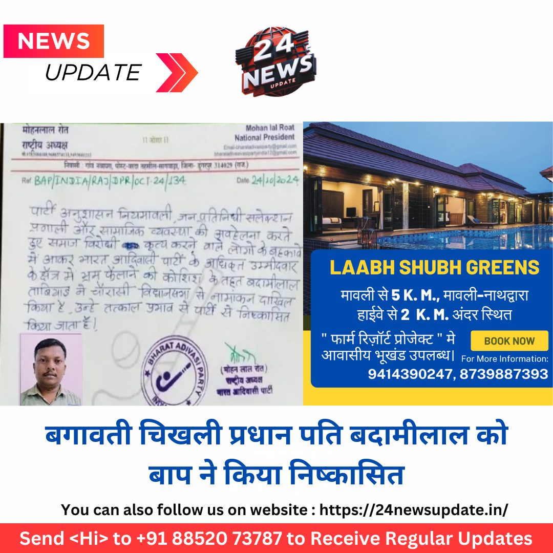 24 न्यूज अपडेट. डूंगरपुर। चौरासी विधानसभा सीट से कल निर्दलीय के रूप में नामांकन दाखिल करने वाले चिखली प्रधान के पति बदामीलाल को बाप पार्टी ने निष्कासित करते हुए बाहर का रास्ता दिखा दियार है। कल इस नामांकन से खलबली मच गई थी व तब से उनका निष्कासन तय माना जा रहा था। आज बाप पार्टी के राष्ट्रीय अध्यक्ष मोहनलाल रोत ने देर रात को निष्कासन के आदेश जारी कर दिए हैं। इस सीट पर भारत आदिवासी पार्टी ने अनिल कटारा को प्रत्याशी घोषित किए गया है। यहां पर प्रबल दावेदार के रूप में माने जा रहे पोपटलाल खोखरिया की बगावत को तय माना जा रहा था लेकिन बाप पार्टी के आला नेताओं की समझाइश के बाद वे मान गए। इस बीच अचानक चिखली प्रधान शर्मिला के पति बदामीलाल ताबियाड़ मैदान में आ डटे। यह किसी पार्टी का एक्शन प्लान माना जा रहा है जिसमें पोपटलाल के मान जाने से खलबली मची हुई है। आदेश कल रात को ही जारी कर दिए गए थे। राष्ट्रीय अध्यक्ष मोहनलाल रोत ने आदेश में लिखा है कि अनुशासन नियमावली, जनप्रतिनिधि सलेक्शन प्रणाली, सामाजिक व्यवस्था की अवहेलना की गई है। समाज विरोधी कृत्य करने वाले लोगों के बहकावे में आकर भारत आदिवासी पार्टी के अधिकृत उम्मीदवार के क्षेत्र में भ्रम फैलाने की कोशिश की है। चौरासी विधानसभा उपचुनाव में निर्दलीय नामांकन भरने पर बदामीलाल ताबियाड़ को पार्टी से तत्काल निष्कासित किया जाता है। इधर, बताया जा रहा है कि एक दल की ओर से बाप में तोड़फोड़ के भरसक प्रयास किए जा रहे हैं लेनिक सफल नहीं होने पर इस तरह की रणनीति अपनाई जा रही है। इसमें आज शाम तक और भी नामांकन करवाए जा सकते हैं। Share this: Share on X (Opens in new window) X Share on Facebook (Opens in new window) Facebook More Email a link to a friend (Opens in new window) Email Share on WhatsApp (Opens in new window) WhatsApp Like this:Like Loading... Related Discover more from 24 News Update Subscribe to get the latest posts sent to your email. Type your email… Subscribe Post navigation रतनपुर बॉर्डर पर 35 लाख की गीली लकड़ी से भरे 2 ट्रक पकड़े बाइक सवार युवक से 7.50 लाख जब्त, गिरफ्तार