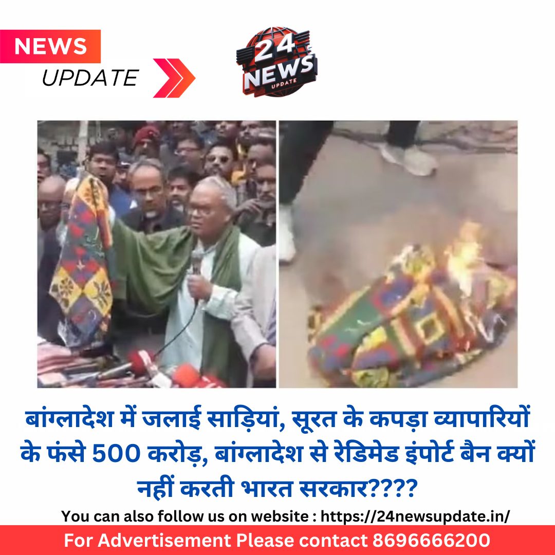 24 न्यूज अपडेट. सूरत। बांग्लादेश में राजनीतिक अस्थिरता के स्थानीय राजनीतिक नेताओं ने भारत में बनी साड़ियों को जलाकर वीडियो जारी किए व भारत के कपड़ा उद्योग पर निशाना साधा तो यहां गुस्सा भड़क उठा। सूरत में कपड़ा उद्योग के व्यापारियों में काफी गुस्सा है.। सूरत के व्यापारियों ने बांग्लादेश के रेडीमेड कपड़ों के आयात पर रोक लगाने की मांग की है। साथ ही भारत सरकार से सूरत के कपड़ा व्यापारियों के वहां पर फंसे 500 करोड़ रुपये वापस दिलाने की भी मांग की है। आपको बता दें कि सूरत का कपड़ा उद्योग दुनिया भर में फैला है। जब भी किसी देश में अस्थिरता आती है तो उसका असर सूरत के कपड़ा उद्योग पर जरूर होता है। बांग्लादेश अभी दुनिया में चीन के बाद सूरत के कपड़ा उद्योग का सबसे बड़ा कंपीटीटर है। रेडीमेड गारमेंट मैन्युफैक्चरिंग हब होने से अब वहां पर नेता सूरत के कपड़ा उद्योग को निशाना बना रहे हैं। सार्वजनिक सभाओं में साड़ियाँ जला रहे हैं और मंचों से मांग कर रहे हैं कि सूरत से साड़ियाँ बांग्लादेश नहीं आनी चाहिए। सूरत की साड़ियों को इस तरह जलता देख यहां पर खासा आक्रोष है। बांग्लादेश में राजनीतिक अराजकता की मौजूदा स्थिति के कारण सूरत के कपड़ा व्यापारियों ने दुर्गा पूजा के दौरान जो व्यापार किया था उसका पैसा नहीं आया है। एक अनुमान के मुताबिक, सूरत के व्यापारियों के 500 करोड़ से ज्यादा रुपए बांग्लादेश में फंसे हुए हैं। वहां के व्यापारी सूरत के व्यापारियों का बिल नहीं चुका रहे हैं। सरकार को वहां की सरकार से इस बात पर चर्चा करनी चाहिए कि बांग्लादेश में फंसे व्यापारियों से तत्काल प्रभाव से पैसा जल्दी वापस दिलाया जा सके।परिधान और मलमल की साड़ियों पर प्रतिबंध लगाएंटेक्सटाइल संगठन के अध्यक्ष ललित शर्मा ने मीडिया से कहा कि बांग्लादेश के नेता न केवल हिंदुओं पर अत्याचार कर रहे हैं, बल्कि साड़ियां जलाकर उद्योग का बहिष्कार भी कर रहे हैं, उन्हें सबक सिखाया जाना चाहिए। सरकार को तुरंत प्रभाव से बांग्लादेश से आने वाले कपड़ों पर प्रतिबंध लगाना चाहिए। बांग्लादेशी नेता सार्वजनिक सभाओं में साड़ियाँ जलाकर हमारे उद्योग को निशाना बना रहे हैं। हम मांग कर रहे हैं कि केंद्र सरकार तुरंत बांग्लादेश से आने वाले परिधान पर प्रतिबंध लगाए. इतना ही नहीं, चूंकि भारत में वहां निर्मित मलमल की साड़ियों का बहुत बड़ा बाजार है, इसलिए वहां से आयातित होने वाली साड़ियों पर भी प्रतिबंध लगाया जाना चाहिए। आमतौर पर हम बांग्लादेश पर निर्भर नहीं हैं, लेकिन कच्चा माल लेकर बांग्लादेश हम पर निर्भर है। अगर केंद्र सरकार बांग्लादेश से आने वाले परिधान पर रोक लगा दे तो हमारे देश के कपड़ा उद्योग को और गति मिल सकती है क्योंकि वहां इकाइयां अभी बंद हैं