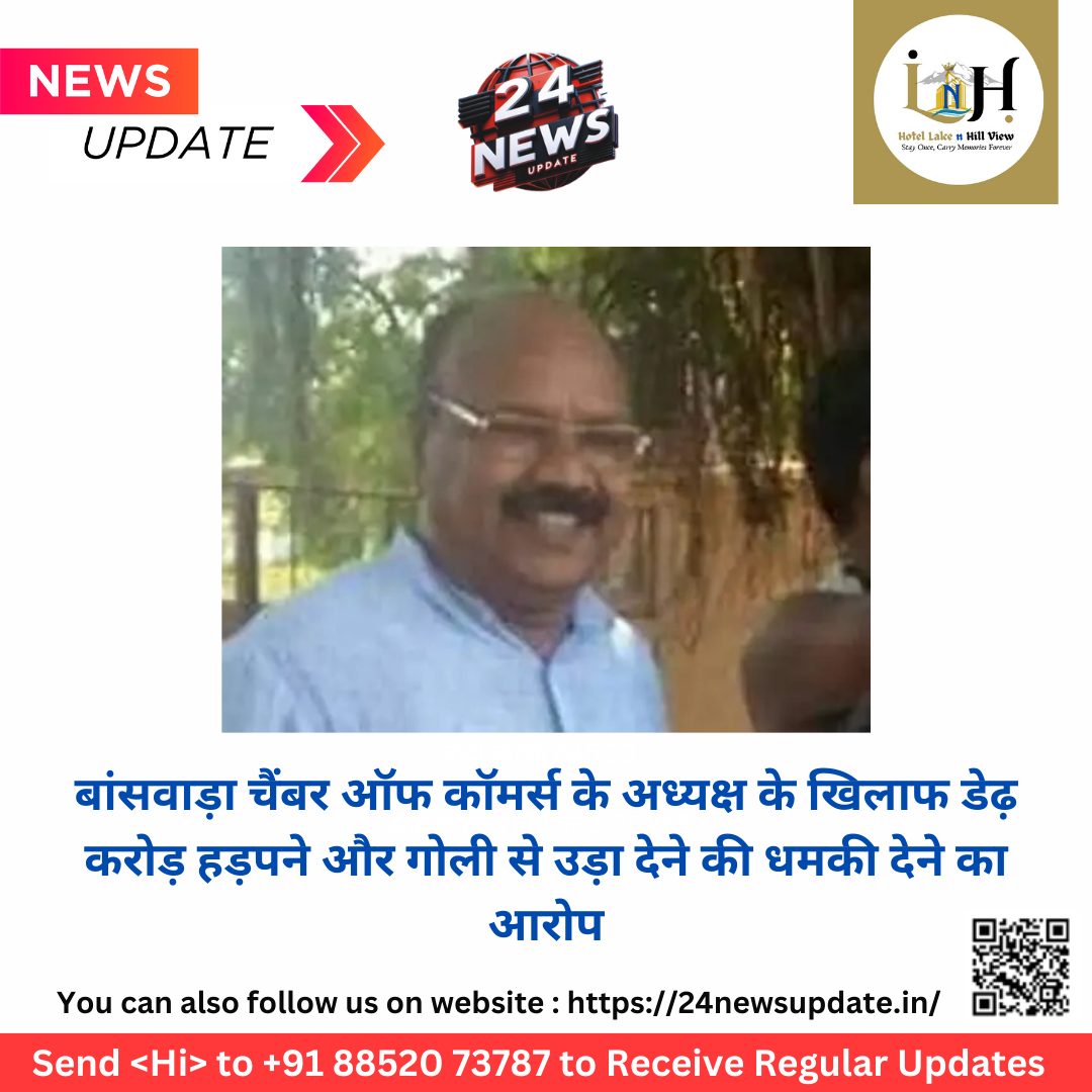 24 न्यूज अपडेट. बांसवाड़ा। उदयपुर के प्रतापनगर थाना क्षेत्र में बांसवाड़ा चैंबर ऑफ कॉमर्स के अध्यक्ष पर दो व्यक्तियों को जमीन बेचकर मूल दस्तावेज और 1.50 करोड़ रुपए हड़पने का आरोप है। इसे लेकर एफआईआर दर्ज हुई है। पुलिस ने बताया कि यूआईटी कॉलोनी, प्रतापनगर निवासी योगेश सालवी ने रिपोर्ट दी कि उन्होंने और साथी राजेंद्र नलवाया ने बांसवाड़ा निवासी चैंबर ऑफ कॉमर्स के अध्यक्ष शंभूलाल हिरण से गोवर्धन विलास में जमीन खरीदी थी। आरोपी ने जमीन की तय कीमत से 1.50 करोड़ रुपए ज्यादा वसूल लिए। फिर रजिस्ट्री कराने के बाद वापस लौटाने का आश्वासन दिया। पिछले 2 अगस्त को शंभूलाल ने जमीन की रजिस्ट्री करवाई। 5 अगस्त को पैसे और जमीन के मूल दस्तावेज देने की बात कही। समय पूरा होने पर उन्होंने बकाया पैसों का तकाजा किया। इस पर आरोपी ने पैसों की मांग करने और किसी को बताने पर घर आकर गोली मारने की धमकी दी। आरोपी ने 1.50 करोड़ और जमीन के मूल दस्तावेज हड़प लिए।