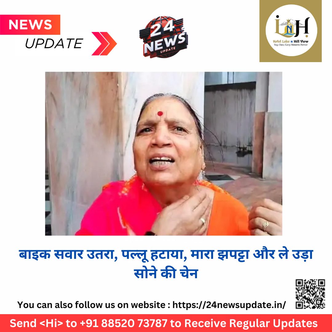 24 न्यूज अपडेट उदयपुर। उदयपुर के भूपालपुरा थाना क्षेत्र में बुधवार को दिन दहाड़े 60 साल की महिला के साथ चेन स्नेचिंग हो गई। बताया गया कि यह महिला एम रोड स्थित अपने घर के बाहर टहल रही थी। उसी समय काले रंग की पल्सर बाइक पर दो बदमाश आए और महिला के गले से सोने की चेन तोड़कर फरार हो गए। इस दौरान महिला घबरा गई व अचानक शोर मचाया और आसपास लोग तुरंत दौड़कर पहुंचे गए। तब तक बदमाश कलेक्टर बंग्ले के पास बंशीपान वाले रास्ते की तरफ से एमजी कॉलेज रोड होते हुए फरार हो गए। थानाधिकारी मुकेश सोनी ने बताया कि 60 वर्षीय चंदा हरकावत घर के बाहर टहल रही थी तभी दो बाइक सवार बदमाश आए। उसी समय दो बाइक सवार टोह ले रहे थे। महिला को टहलता देख कर वे अचानक उसके पास आकर रूक गए। बाइक चालू थे व उससे एक व्यक्ति उतरा। उसने महिला का पल्लू हटाया और उसके बाद झपट्टा मारते हुए महिला की चेन तोड़ी ली व चालू बाइक पर अपने साथी के साथ बैठक कर मौके से फरार हो गया। पीड़ित महिला ने भूपालपुरा थाने में इस बारे में मुकदमा दर्ज करवाया हैं इस मामले में पुलिस ने आसपास के सीसीटीवी फुटेज भी देखे हैं व बदमाश थोड़ी दूरी तक आगे जाते हुए भी दिखाई दे रहे हैं। पुलिस बदमाशों की तलाश में जुटी हुई है।