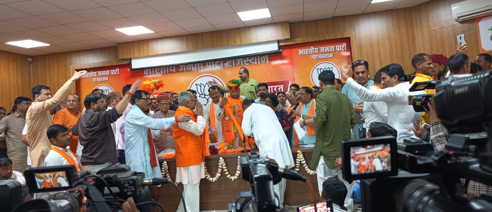जयपुर। आज चार निर्दलीय विधायकों ने बीजेपी को अपना समर्थन दे दिया है। इनमें चित्तौड़गढ़ विधायक चंद्रभान सिंह, सांचौर विधायक जीवाराम चौधरी, हनुमानगढ़ विधायक गणेश राज और बयाना से विधायक रितु बनावत शामिल हैं। इसके साथ ही पूर्व सांसद गोपाल सिंह ईडवा ने भी बीजेपी जॉइन की। बीजेपी से बागी होकर कोटपूतली से चुनाव लड़ने वाले मुकेश गोयल, बस्सी से चुनाव लड़ने वाले जितेंद्र मीणा, जालम सिंह रावलोत, विकेश खोलिया, सुखवंत सिंह, विजय मीणा और दानाराम चौधरी भी बीजेपी में शामिल हुए। इस दौरान बीजेपी प्रदेश अध्यक्ष सीपी जोशी ने कहा- गोपाल सिंह ईडवा ने मेरे सामने चुनाव लड़ा था। आज बीजेपी में शामिल हो गए हैं। इन्होंने आज बिना शर्त भारतीय जनता पार्टी जॉइन की है।