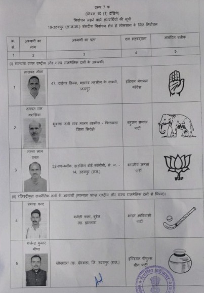 नाम वापसी का समय बीतने के बाद उदयपुर में अब कुल आठ प्रत्याशी चुनाव मैदान में रह गए हैं, उदयपुर से तारांचद मीणा हाथ, कांग्रेस, मन्नालाल रावत कमल, भाजपा, दलपतराम गरासिया हाथी का निशान बसपा, प्रकाशचंद हॉकी स्टिक एंड बॉल बीएपी राजेंद्र कुमार मीणा घड़ा-इंडियन पीपुल्स ग्रीन पार्टी, कानजीलाल डामोर हल का निशान, निर्दलीय, प्रभुलाल मीणा, पलंग का निशान निर्दलीय और डॉ सविता कुमारी अहारी, सिलेण्डर का निशान निर्दलीय अब चुनाव मैदान में है।