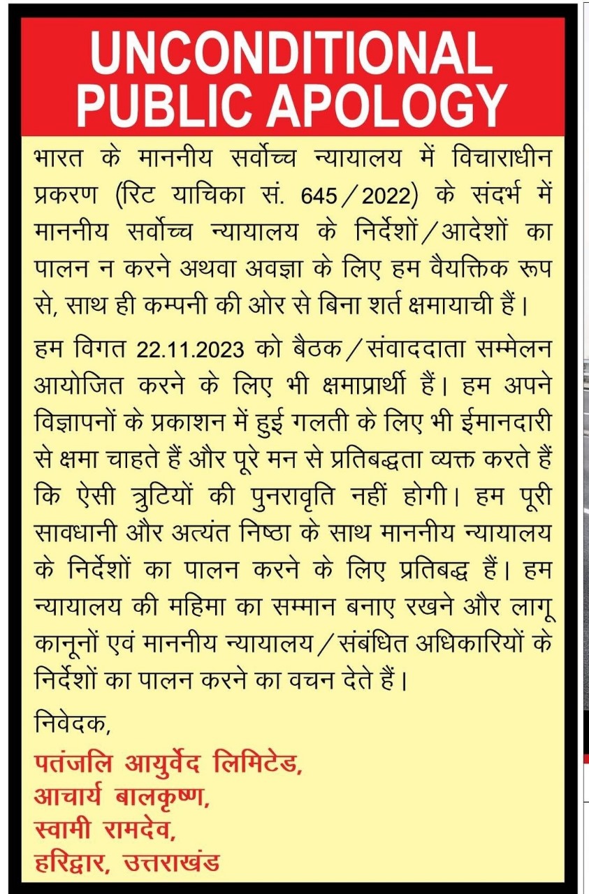 हम विगत 22.11.2023 को बैठक / संवाददाता सम्मेलन आयोजित करने के लिए भी क्षमाप्रार्थी हैं। हम अपने विज्ञापनों के प्रकाशन में हुई गलती के लिए भी ईमानदारी से क्षमा चाहते हैं और पूरे मन से प्रतिबद्धता व्यक्त करते हैं कि ऐसी त्रुटियों की पुनरावृति नहीं होगी। हम पूरी सावधानी और अत्यंत निष्ठा के साथ माननीय न्यायालय के निर्देशों का पालन करने के लिए प्रतिबद्ध है। हम न्यायालय की महिमा का सम्मान बनाए रखने और लागू कानूनों एवं माननीय न्यायालय / संबंधित अधिकारियों के निर्देशों का पालन करने का वचन देते हैं।