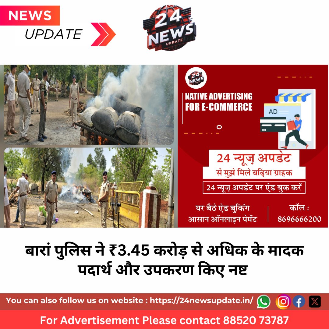 24 News Update जयपुर, 30 मई। बारां जिला पुलिस ने शुक्रवार को एक बड़ी कार्रवाई करते हुए रिजर्व पुलिस लाइन बारां में 3 करोड़ 45 लाख 97 हजार रुपये की अनुमानित कीमत के जब्तशुदा मादक पदार्थों और संबंधित उपकरणों को नष्ट कर दिया। यह कदम भारत सरकार के गृह मंत्रालय के निर्देशानुसार 15 मई से 30 मई, 2025 तक देश भर में चलाए जा रहे स्वापक औषधि और मनः प्रभावी पदार्थ अधिनियम 1985 (एमडीपीएस एक्ट) में जब्त मादक पदार्थों के निपटान के विशेष अभियान के तहत उठाया गया है।