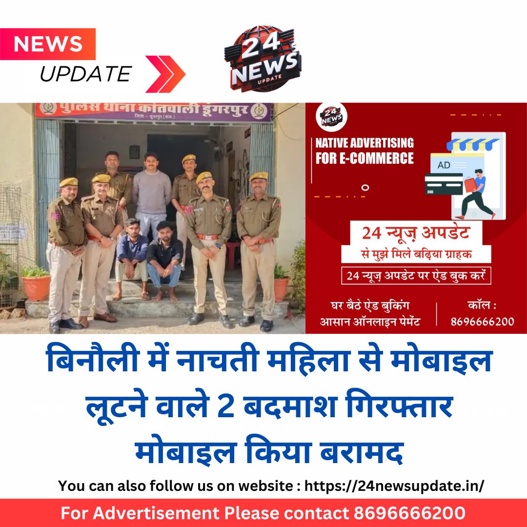 24 न्यूज अपडेट.डूंगरपुर। कोतवाली पुलिस ने मोबाइल लूटने वाले 2 बदमाशों को गिरफ्तार कर लिया है। इन्होंने बिनौली के बीच से नाचती हुई महिला का मोबाइल छीन लिया था। भागते हुए पकड़े गए मगर फिर से भाग निकले। कोतवाली थानाधिकारी भगवानलाल ने बताया कि माधुरी पत्नी प्रकाश कतरा निवासी भाटपुर की रिपोर्ट पर जांच की गई। बताया गया कि 1 दिसम्बर को माधुरी अपने पति के साथ सुभाषनगर में रिश्तेदार के बिनौले के कार्यक्रम में शामिल होने गई थी। बिंदौली नया हॉस्पिटल चौराहा पर आई व वहांपर सब डांस कर रहे थे। इस दौरान 2 युवक आए और अचानक महिला के हाथ से मोबाइल लूट लिया। चिल्लाने पर पति प्रकाश ने एक बदमाश को पकड़ लिया, लेकिन वह भी हाथ छुड़ाकर भाग गया। इसमामले में एएसआई दिलीप सिंह, कॉन्स्टेबल मयूर, दिनेश चंद्र, रविंद्र और विशाल की टीम ने आरोपियों की तलाश करते हुए 2 बदमाशों को गिरफ्तार किया है। थानाधिकारी के अनुसार आरोपी विशाल (20) पुत्र शंकरलाल कटारा निवासी माथुगामडा फला रेलडा ओर राजकुमार (20) पुत्र कृष्णलाल डामोर निवासी अमरपुरा फला नई बस्ती थाना कल्याणपुर जिला उदयपुर को गिरफ्तार किया है। दोनों ने लूटपाट की वारदात कबूल कर ली है। उसके कब्जे से लुटा गया मोबाइल बरामद कर लिया है।