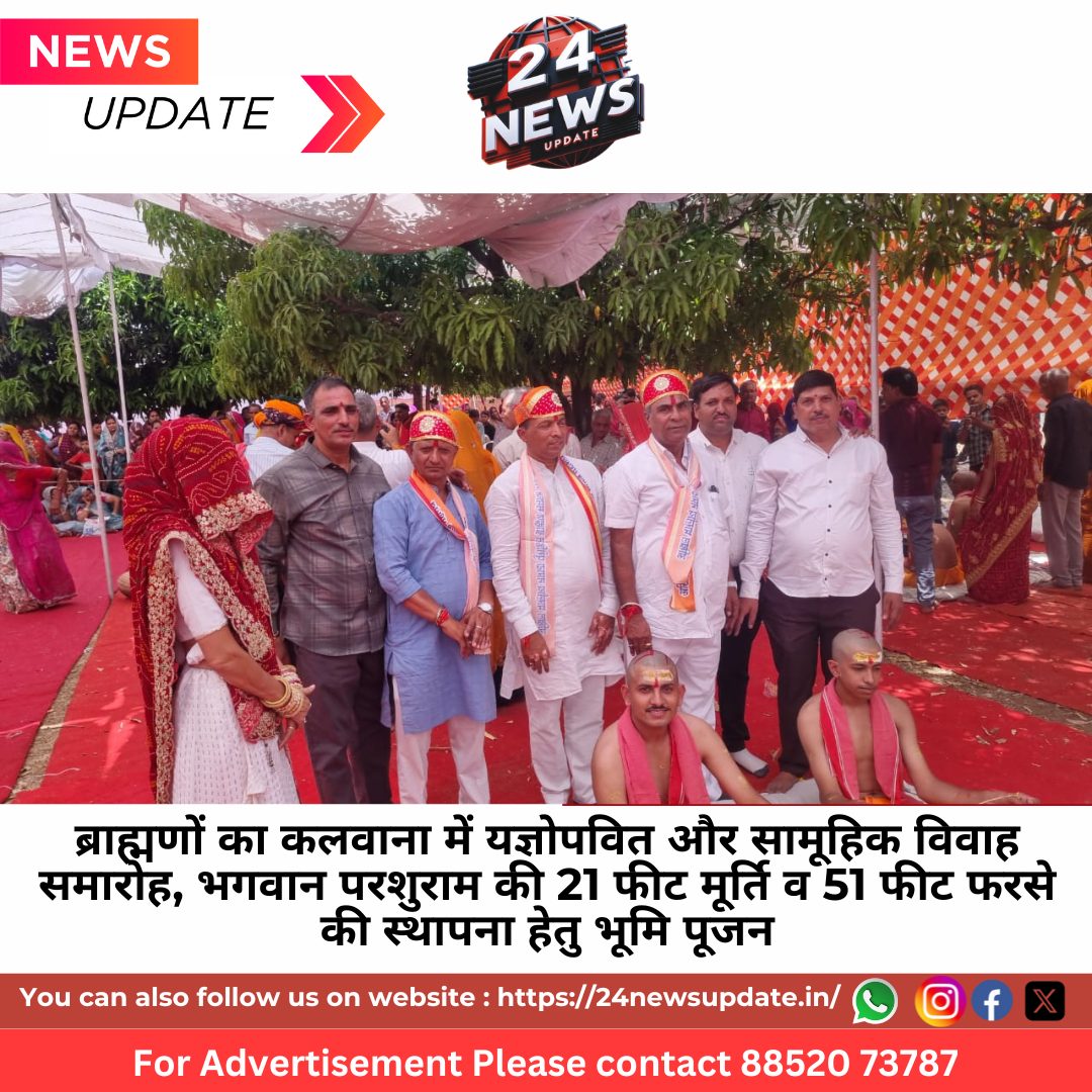24 News Update गोगुंदा/सायरा। उदयपुर जिले की सायरा तहसील के ग्राम ब्राह्मणों का कलवाना में रविवार को अखिल भारतीय नागदा पुरोहित ब्राह्मण समाज महासंघ के तत्वावधान में भव्य सामूहिक यज्ञोपवित संस्कार एवं विवाह समारोह का आयोजन किया गया। इस अवसर पर भगवान परशुराम की 21 फीट ऊंची प्रतिमा और 51 फीट लम्बे फरसे की स्थापना हेतु भूमि पूजन भी विधिपूर्वक किया गया। समाज के वरिष्ठ सदस्य प्रकाश जोशी ने बताया कि समारोह में 101 बटुकों को वैदिक विधि-विधान से उपनयन संस्कार के अंतर्गत यज्ञोपवित धारण करवाया गया। साथ ही समाज के 9 जोड़ों का वैदिक रीति से सामूहिक विवाह भी सम्पन्न हुआ। यह आयोजन ब्राह्मण समाज की एकता, परंपरा और संस्कारों को सशक्त करने की दिशा में एक महत्वपूर्ण कदम माना जा रहा है। भगवान परशुराम की विशाल प्रतिमा और प्रतीकात्मक फरसे की स्थापना के लिए भूमि पूजन समारोह भी आयोजन का प्रमुख आकर्षण रहा। इस मौके पर विप्र फाउंडेशन सूरत महानगर अध्यक्ष घनश्यामलाल सेवक और मीठालाल पालीवाल मुख्य अतिथि के रूप में उपस्थित रहे।