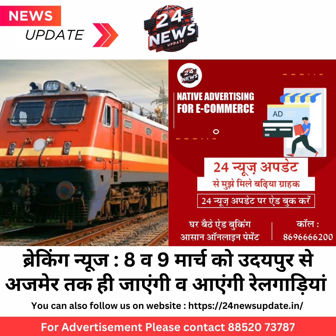 - गाडी संख्या 12991, उदयपुर-जयपुर रेलसेवा जो दिनांक 09.03.25 को उदयपुर से प्रस्थान करेगी वह रेलसेवा अजमेर तक संचालित होगी अर्थात् यह रेलसेवा अजमेर-जयपुर स्टेशनों के मध्य आंशिक रद्द रहेगी।