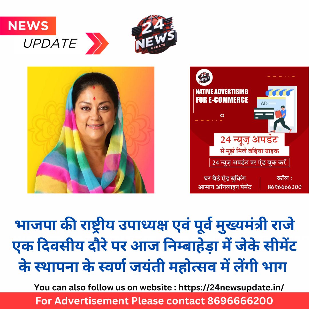 कविता पारख 24 न्यूज़ अपडेट निम्बाहेड़ा। भारतीय जनता पार्टी की राष्ट्रीय उपाध्यक्ष एवं राज्य की पूर्व मुख्यमंत्री श्रीमती वसुंधरा राजे सिंधिया 12 दिसंबर, गुरुवार को एक दिवसीय निम्बाहेड़ा दौरे पर रहेगी।पूर्व स्वायत्त शासन मंत्री एवं विधायक श्रीचंद कृपलानी ने बताया कि श्रीमती राजे 12 दिसंबर, गुरुवार को प्रातः 9.30 बजे हेलीकॉप्टर के माध्यम से नई दिल्ली से रवाना होकर प्रातः 11 बजे डॉ. भीमराव अंबेडकर राजकीय महाविद्यालय के खेल मैदान में बने अस्थाई हेलीपैड पर पहुंचेगी। विधायक कृपलानी ने बताया कि हेलीपैड पर क्षेत्र के भारतीय जनता पार्टी के पदाधिकारियों एवं कार्यकर्ताओं के द्वारा स्वागत किया जाएगा, ततपश्चात हेलीपैड के समीपस्थ राजमाता विजया राजे सिंधिया उद्यान में राजमाता की आदमकद प्रतिमा पर माल्यार्पण के पश्चात जे.के. सीमेंट के स्वर्ण जयंती समारोह में भाग लेने पहुंचेगी। कृपलानी ने बताया कि यहां से दोपहर 2 बजे हेलीकॉप्टर के द्वारा पुनः नई दिल्ली के रवाना होंगी। Share this: Share on X (Opens in new window) X Share on Facebook (Opens in new window) Facebook More Email a link to a friend (Opens in new window) Email Share on WhatsApp (Opens in new window) WhatsApp Like this:Like Loading... Related Discover more from 24 News Update Subscribe to get the latest posts sent to your email. Type your email… Subscribe Post navigation जे. के. सीमेन्ट के स्वर्ण जयन्ती महोत्सव अति लक्ष्मीनारायण यज्ञ की पूर्णाहुति कल दिनांक 12 दिसम्बर को पूर्व मुख्यमन्त्री एवं लोकप्रिय श्रीमती वसुन्धरा राजे होगी शामिल श्रीनाथ जी मन्दिर नाथद्वारा के तिलकायत श्री विशाल बाबा भी आयेगें निम्बाहेड़ा आज भगवान श्री राधाकृष्ण को अर्पण किया गया 56 भोग केली प्रखण्ड की बैठक में केली ग्राम कार्यकारणी का गठन