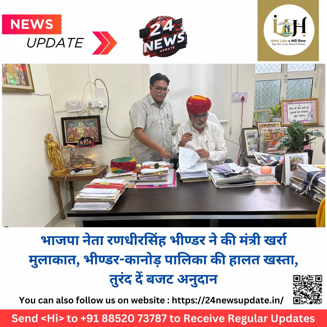 24 न्यूज अपडेट. उदयपुर। भीण्डर व कानोड़ नगर पालिका में बजट आवंटन की मांग को लेकर वल्लभनगर के पूर्व विधायक तथा भाजपा नेता रणधीर सिंह भीण्डर ने स्थानीय निकाय एवं नगर विकास मंत्री झाबरसिंह खर्रा से मुलाकात की। रणधीर सिंह भीण्डर ने बताया कि स्वायत्त शासन विभाग द्वारा 15 वें वित आयोग की सिपारिशों के तहत अनुदान की प्रथम किस्त 184 नगर निगम व पालिकाओं को आवंटित कर दी गई है। इसमें भीण्डर व कानोड़ नगर पालिका को कोई राशि आवंटित नहीं की गई। जबकि दोनों नगर पालिकाओं की आर्थिक स्थिति गंभीर हैं, इसलिए दोनों नगर पालिकाओं को 15 वें वित आयोग की अनुदान राशि आवंटित करने का आदेश तुरंत किया जाए।