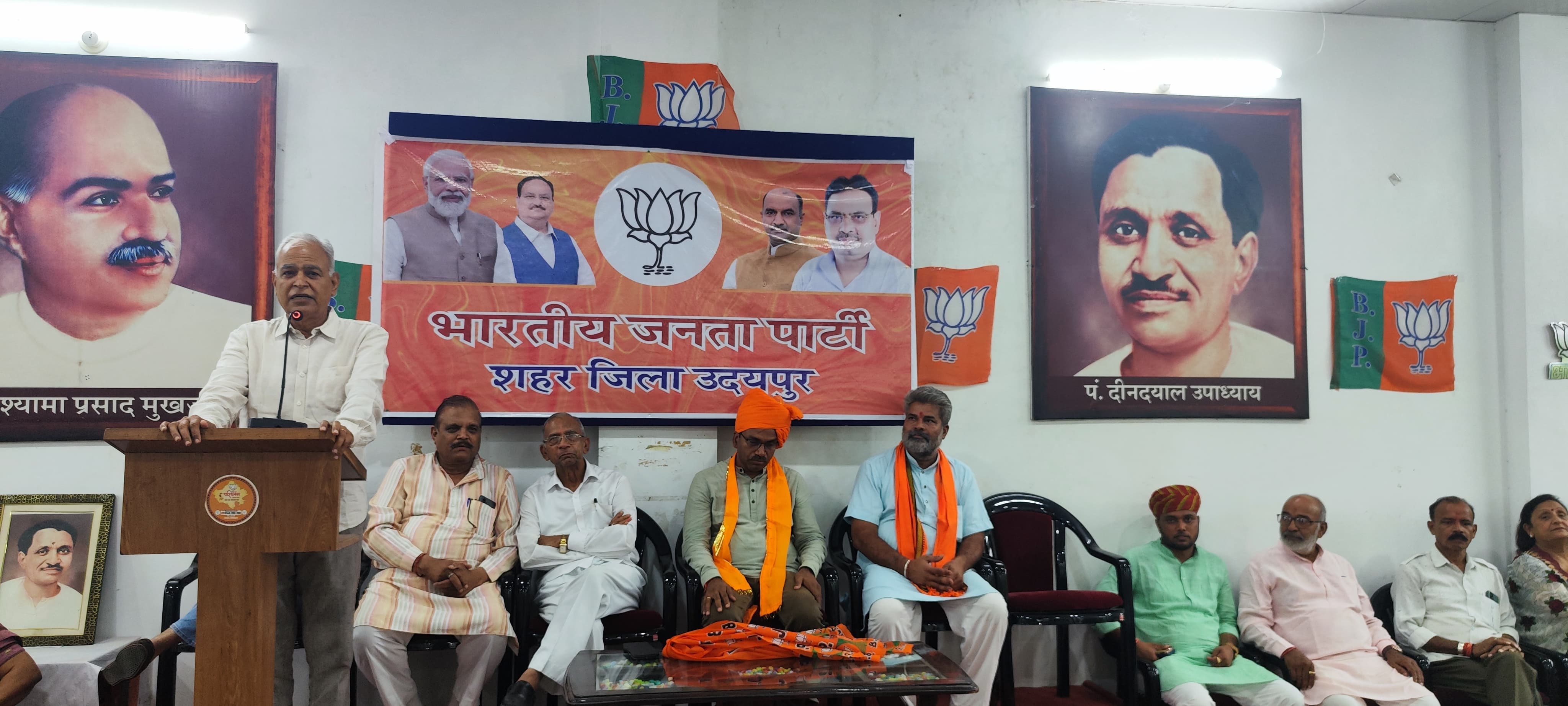 भारतीय जनता पार्टी के नवनिर्वाचित उदयपुर लोकसभा सांसद डॉ.मन्ना लाल रावत के स्वागत के लिये प्रदेश, जिला ,मंडल पदाधिकारी पटेल सर्कल स्थित पार्टी कार्यालय पहुचें जहां पर उनके अभिनंदन कार्यक्रम मैं शहर जिला अध्यक्ष रवीन्द्र श्रीमाली ,देहात अध्यक्ष चन्द्रगुप्त सिंह चौहान, सहकारिता प्रकोष्ठ प्रदेश संयोजक प्रमोद सामर, पूर्व विधानसभा अध्यक्ष शान्तिलाल चपलौत,जिला प्रभारी बंसीलाल खटीक, पूर्व जिला अध्यक्ष दिनेश भट्ट, प्रदेश मंत्री कन्हैयालाल मीना, पूर्व प्रधान तख्त सिंह शक्तावत,उप महापौर पारस सिंघवी, पूर्व महापौर रजनी डांगी, चंद्र सिंह कोठारी, ओबीसी मोर्चा प्रदेश उपाध्यक्ष,जगदीश शर्मा, शैलेन्द्र चौहान, महामंत्री गजपाल सिंह, मनोज मेघवाल, किरण जैन, दीपक शर्मा, जिला उपाध्यक्ष प्रेम सिंह, खूबीलाल पालीवाल, अतुल चंडालिया ,हंसा माली जिला मंत्री करण सिंह,डॉ अमृत मेनारिया,भरत पूरबीया, दीपक बोल्या, गजेंद्र भंडारी, मंडल अध्यक्ष ,पार्षद कार्यकर्ता उपस्थित थे।प्रारंभ में जिला अध्यक्ष रवींद्र श्रीमाली एवं चंद्रगुप्त सिंह चौहान ने सभी कार्यकर्ताओं का आभार व्यक्त करते हुए कहा कि लोकसभा चुनाव में प्रत्येक कार्यकर्ता और पदाधिकारी को जो जो भी दायित्व दिया गया उसका भली भांति निष्ठा पूर्वक निर्वहन किया गया जिसका परिणाम सुखद प्राप्त हुआ और श्रीमन्नालाल रावत ने ऐतिहासिक मतों से विजय प्राप्त की। पूर्व विधानसभा अध्यक्ष शांतिलाल चपलोत ने कहां की लोकसभा संयोजक के रूप में प्रमोद सामर ने जिस प्रकार से संपूर्ण लोकसभा क्षेत्र की विधानसभा में कार्यकर्ताओं को लेकर जिस प्रकार से चुनाव प्रबंधन किया वह वास्तव में बहुत ही सराहनीय है। उन्होंने कहा कि प्रमोद सामर ने स्वयं तो इलेक्शन नहीं लड़े परंतु इनका चुनाव लड़ने का अनुभव इन्हें चैंपियंस ऑफ इलेक्शन का खिताब दिलाता है। प्रमोद सामर ने प्रत्येक कार्यकर्ताओं का आभार व्यक्त करते हुए कहा कि भारतीय जनता पार्टी ही ऐसी पार्टी है जिसमें प्रत्येक कार्यकर्ता अपने को उम्मीदवार मानकर चलता है और उसकी तैयारी एक उम्मीदवार की तैयारी के रूप में ही होती है उन्होंने कहा कि जिस प्रकार से संगठन की रचना और कार्यकर्ताओं का बूथ स्तर पर प्रबंधन हुआ उसी का परिणाम हुआ हमें ऐतिहासिक विजय प्राप्त हुई।भारतीय जनता पार्टी के नवनिर्वाचित सांसद मन्नालाल रावत ने सभी कार्यकर्ताओं के समक्ष नतमस्तक होते हुए जिस प्रकार से पार्टी के कार्यकर्ताओं ने उनके लिए दिन-रात मेहनत मशक्कत की और चुनाव में जी जान लगाकर जिस प्रकार से अपने बूथ पर चुनाव का प्रबंध किया और अधिक से अधिक मतदान करा कर भारतीय जनता पार्टी के कमल चिन्ह की जीत सुनिश्चित की और ऐतिहासिक स्वरूप प्रदान किया उसके लिए 