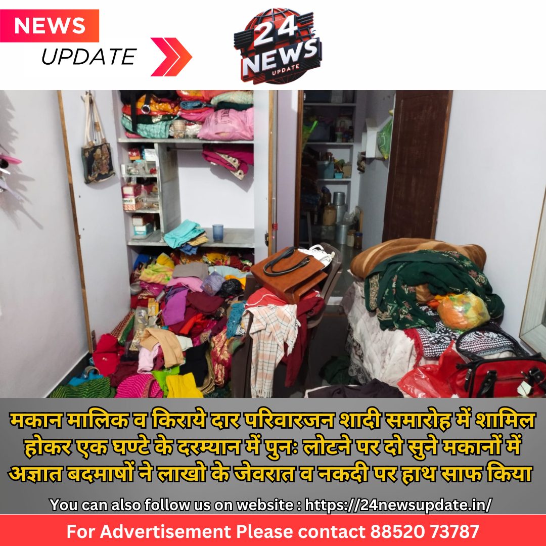 कविता पारख 24 न्यूज़ अपडेट निम्बाहेडा। पुलिस थाना क्षेत्र में सिथत उदयपुर मार्ग पर स्थित निवेदिता कॉलोनी में मंगलवार षाम को दोनो परिवाजन समिप षादी समारोह में गए हुए थें कि एक घण्टे में ही पिछे से अज्ञात बदमाषों ने दुसरी मंजिल पर दो हिस्सों में मकान मालिक व किराये दार दोनो परिवारों के मकान के मेन गेट का ताला तोडकर दोनो परिवाजनों के अलग-अलग हिस्सों के कमरों में रखी आलमारी व लॉकर में से लाखों के जेवरात के साथ नकदी व बादाम आदि सामान चोरी कर ले गए।मकान मालिक उदयलाल व्यास पिता नन्दराम व्यास , मूल निवासी गांव भट् कोटडी ,हॉल मुकाम निवेदिता कॉलोनी निवासी निम्बाहेडा ने बताया कि उदयपुर रोड पर निवेदिता कॉलोनी में दुसरी मंजिल पर एक मकान के दो हिस्सों में मेरा परिवार ओर किरायेदार दोनो परिवारजन कॉलोनी में हो रही षादी समारोह में षाम 8 बजे करीब षामिल होने के लिए गए ,समारोह से पुनः एक घण्टे बाद करीब 9 बजे लोटने पर मकान के मेन गेट का ताला टूटा हुआ पाया गया । दोनो मकान के कमरों में रखी लोहे की आलमीरा व लोहे का लॉकर पंलग आदि को अज्ञात बदमाषों द्वारा खंगाला गया। जहां उदयलाल व्यास के कमरों में से सोने की चेन, पेण्डिल,कुन्दन आदि करीब 14 से 15 तोला सोने के जेवरात के साथ करीब 25 हजार नकदी अज्ञात बदमाषों ने दोनो कमरों को खंगालने से सारे सामान बहार बिखेर कर चोर किमती सामान लेकर चले गए। वहीं किरायेदार गोबिन्द सहायष्षर्मा निवासी निम्बाहेडा के कमरों में रखी लोहे की आलमीरा को भी अज्ञात चोरो ने खंगाल कर सारा सामान बिखेर कर 10 से 12 तोला सोने के जेवरात एक लाख पचास हजार नकदी ले गए। इतना ही नहीं चोरो ने घर में रखे नए कपडे और बादाम जैसी खाद्वय सामग्री भी नहीं छोडी । घटना की जानकारी तक सामने आई जब पडोसी कैलाष चन्द्र मूंदडा और आयकर एडवोकेट विजय प्रकाष काबरा निवेदित कॉलोनी निम्बाहेडा ने पीडित परिवारों से घटनाक्रम की जानकारी लेकर पुलिस अधिकारियों को सूचित किया। सूचना मिलते ही पुलिस मौके पर पंहुची और मामले की जांच षुरू कर दी। पुलिस मकान में चोरी की घटनाक्रम के आस-पास के सीसीटीवी केमरों में फुटेज की जांच कर रही हैं और संदिग्धों की तलाष में जुटी हुई हे।मकान मालिक व्यास ने बताया कि मेरी कपडे की दुकान मकान के नीचे ही उसे बंद कर उपर षादी समारोह में तैयार होकर समारोह में षामिल गए हुए थे। पिछे से चोरो ने दोनो के हिस्से में दोनो परिवारो के मकानों के कमरों को अज्ञात चोरो ने खंगालते हुए लाखों के जेवरात व नकदी पर हाथ साफ कर दिया कि चोरी की वारदात की सूचना मिलते ही काफी संख्या में कॉलोनिवासी एकत्रित होने पर आस-पास के कॉलोनीवासी ने बताया कि तीन-चार अनजान युवक एक दो धण्टे से घुमकर रेंकी पहले से कर रहे थे । संभवतया जो अनजान युवक इधर-उधर घुम 