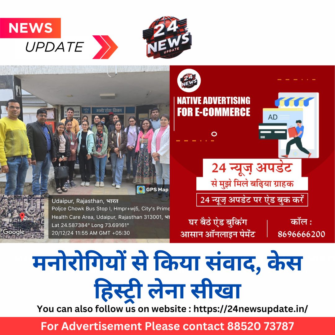 24 न्यूज अपडेट. उदयपुर। मनोविज्ञान विभाग, मोहनलाल सुखाड़िया विश्वविद्यालय और महाराणा भूपाल चिकित्सालय के एमओयू के तहत विभाग के स्नातकोत्तर 3 सेमेस्टर के विद्यार्थियों ने 20 दिसम्बर को एम बी हॉस्पिटल के मनोचिकित्सा विभाग का दौरा किया। मनोविज्ञान विभाग की सहायक आचार्य डॉक्टर रश्मि सिंह ने बताया कि यह विजिट का उद्देशय विद्यार्थियों के पाठ्यक्रम की विभिन्न अवधारणाओं को समझने का है। यहाँ विद्यार्थियों के सैद्धांतिक ज्ञान को व्यवहारिक तौर पर समझाया व दिखाया गया। एम. बी हॉस्पिटल के मनोचिकित्सा विभाग के प्रभारी डॉक्टर सुरेश गोचर ने विद्यार्थियों को विभिन्न मानसिक रोग विषाद, चिंता विकृति, उन्मत्त और सिज़ोफ्रेनिया जैसे रोग, दौरे आने के कारण उनके लक्षणों व उनके उपचारों के बारे में विस्तृत जानकारी दी। विद्यार्थियों ने वहां भर्ती मानसिक रोगियों से संवाद किया और यह भी देखा कि डॉक्टर द्वारा उनके केस हिस्ट्री कैसे ली जाती है। यहाँ विद्यार्थियो ने स्नायुविकृति व मनोविकृति के बीच अन्तर को समझा।