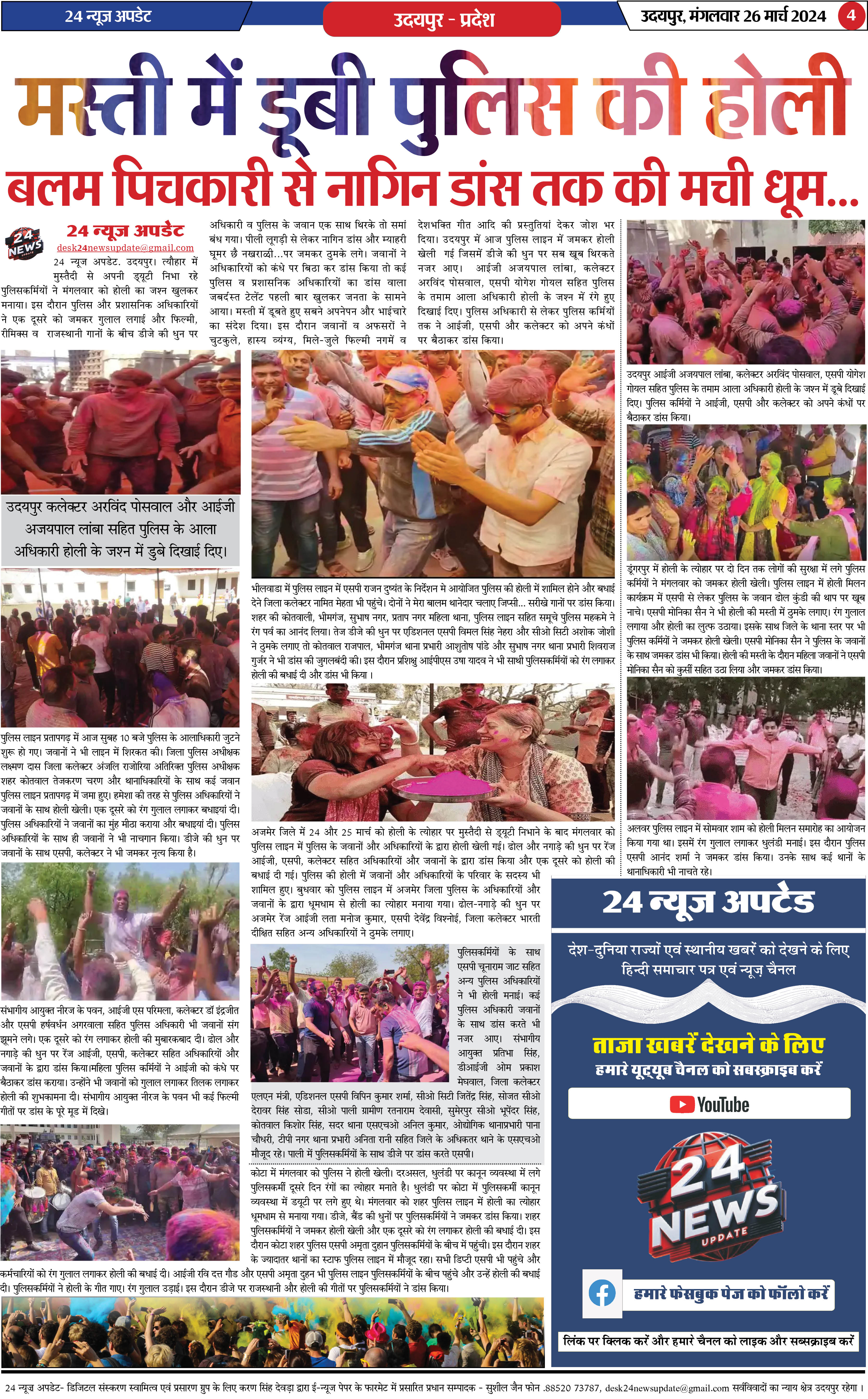 24 न्यूज अपडेट. उदयपुर। त्यौहार में मुस्तैदी से अपनी ड्यूटी निभा रहे पुलिसकर्मियों ने मंगलवार को होली का जश्न खुलकर मनाया। इस दौरान पुलिस और प्रशासनिक अधिकारियों ने एक दूसरे को जमकर गुलाल लगाई और फिल्मी, रीमिक्स व राजस्थानी गानों के बीच डीजे की धुन पर अधिकारी व पुलिस के जवान एक साथ थिरके तो समां बंध गया। पीली लूगड़ी से लेकर नागिन डांस और म्याहरी घूमर छै नखराळी़़़…पर जमकर ठुमके लगे। जवानों ने अधिकारियों को कंधे पर बिठा कर डांस किया तो कई पुलिस व प्रशासनिक अधिकारियों का डांस वाला जबर्दस्त टेलेंट पहली बार खुलकर जनता के सामने आया। मस्ती में डूबते हुए सबने अपनेपन और भाईचारे का संदेश दिया। इस दौरान जवानों व अफसरों ने चुटकुले, हास्य व्यंग्य, मिले-जुले फिल्मी नगमें व देशभक्ति गीत आदि की प्रस्तुतियां देकर जोश भर दिया। उदयपुर में आज पुलिस लाइन में जमकर होली खेली गई जिसमें डीजे की धुन पर सब खूब थिरकते नजर आए। आईजी अजयपाल लांबा, कलेक्टर अरविंद पोसवाल, एसपी योगेश गोयल सहित पुलिस के तमाम आला अधिकारी होली के जश्न में रंगे हुए दिखाई दिए। पुलिस अधिकारी से लेकर पुलिस कर्मियों तक ने आईजी, एसपी और कलेक्टर को अपने कंधों पर बैठाकर डांस किया।
