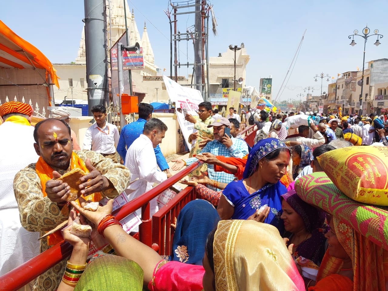 उदयपुर। तिलकायत श्री की आज्ञा एवं विशाल बावा की प्रेरणा से श्रीजीप्रभु के 1 लाख एक मठड़ी के महाप्रसाद का रामनवमी पर अयोध्या में प्रभुश्रीराम के भक्तों को वितरित किया गया। महाप्रसाद की महा यात्रा के रूप में श्रीजी प्रभु का एक लाख एक मठड़ी का भोग श्रीनाथ द्वार से रामद्वार तक विभिन्न पड़ावों जिनमें नाथद्वारा से भीलवाड़ा, जयपुर,मथुरा,लखनऊ होते हुए आज रामनवमी के पर अयोध्या पहुंचा एवं श्रीजी प्रभु के महाप्रसाद को श्री राम लला प्रभु को आरोगाया गया। श्रीजी प्रभु के महाप्रसाद को अयोध्या में विभिन्न स्थलों पर श्रीजी प्रभु के सेवकों एवं राम भक्तों ने तथा राष्ट्रीय स्वयं सेवक संघ के सदस्यों ने अलग-अलग जगह जिनमें श्री राम मंदिर के भंडारे में,हनुमानगढ़ी के मंदिर में,नया घाट, श्री महाप्रभु जी की बैठक आदि जगहों पर प्रभु के भक्तों को मठड़ी के महाप्रसाद को वितरित किया गया। श्री जी प्रभु के मठड़ी के महाप्रसाद को कनका रूप में अयोध्या में लाखों लोगों ने श्रीजी प्रभु की कृपा समझ कर ग्रहण किया तथा श्रीजी प्रभु के इस महाप्रसाद के महायात्रा के अभियान के लिए तिलकायत श्री एवं श्री विशाल बावा का आभार एवं धन्यवाद प्रकट किया। महाप्रसाद का वितरण नाथद्वारा से आए सेवकों जिनमें तिलकायत के सचिव लीलाधर पुरोहित, समाधानी उमंग मेहता,मीडिया प्रभारी एवं पीआरओ गिरीश व्यास, वैष्णव गिरीश भाई शाह,जमादार हर्ष सनाढ्य, कल्पित,प्रतिक,भावेश,महर्षि व्यास,ऋषि पांडे, कमलेश,अमित,सुनील, मयंक, मोहित, पुरुषोत्तम,जेकी, बापू लाल आदी ने अपनी सेवाएं दी
