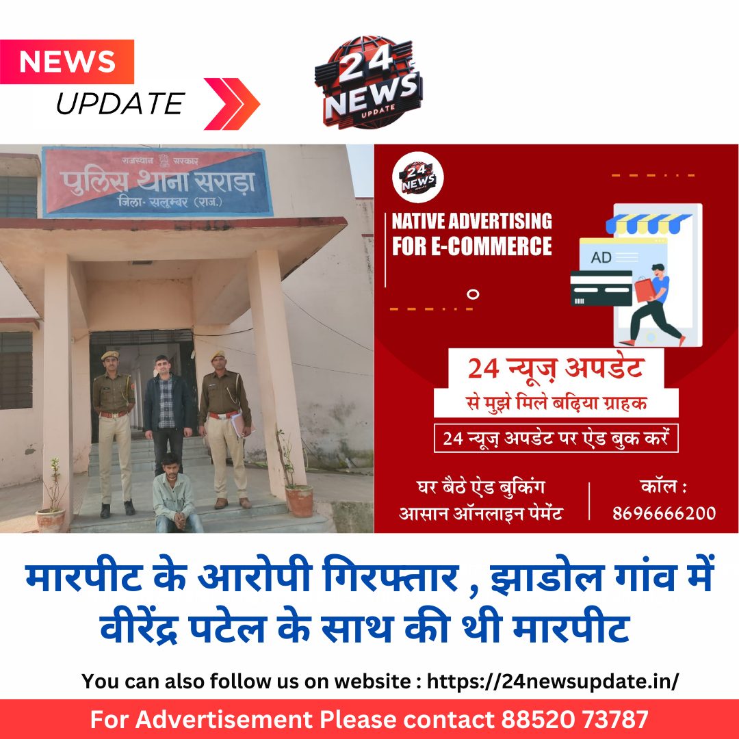 24 न्यूज़ अपडेट सलूंबर. सलूंबर जिले की सराडा थाना पुलिस ने 2 दिन पहले हुए झाडोल गांव में राहगीर के साथ मारपीट की वारदात को अंजाम देने वाले आरोपियों को गिरफ्तार किया है । सराड़ा थानाधिकारी हेमंत अहारी ने बताया कि झाडोल निवासी नरेश पटेल थाने पर रिपोर्ट देते हुए बताया कि उसके पिताजी वीरेंद्र पटेल रात करीब 10 बजे अपने घर से बाड़े की तरफ जा रहे थे तभी बीच रास्ते में अनजान लड़कों द्वारा वीरेंद्र के साथ मारपीट कर दी जिससे उनको गंभीर चौटे आई । प्रार्थी की रिपोर्ट पर सराड़ा डिप्टी चांदमल सिंगारिया के निर्देश पर सराडा पुलिस ने कार्रवाई करते हुए दीपक पिता वालाजी मीणा निवासी गामडी जयसमंद सहित 2 बाल अपचारी को डिटेन किया है । मामले को लेकर उनसे पूछताछ की जा रही है ।