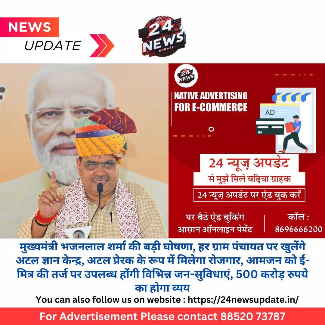 24 न्यूज अपडेट. जयपुर। मुख्यमंत्री भजनलाल शर्मा ने पूर्व प्रधानमंत्री स्व. अटल बिहारी वाजपेयी के जन्म शताब्दी दिवस के उपलक्ष्य में आयोजित सुशासन दिवस के अवसर पर प्रदेश की प्रत्येक ग्राम पंचायत पर अटल ज्ञान केन्द्र शुरू करने की घोषणा की है। शर्मा ने कहा कि युवाओं को जागरूक करने के साथ ही उन्हें प्रशिक्षण सुविधायें उपलब्ध कराने के लिए प्रत्येक ग्राम पंचायत पर चरणबद्ध रूप से अटल ज्ञान केन्द्र की स्थापना की जाएगी। इन केन्द्रों के लिए स्थानीय युवक-युवती का अटल प्रेरक के रूप में चयन किया जायेगा। इससे ग्रामीण युवाओं को रोजगार के नए अवसर उपलब्ध होंगे।