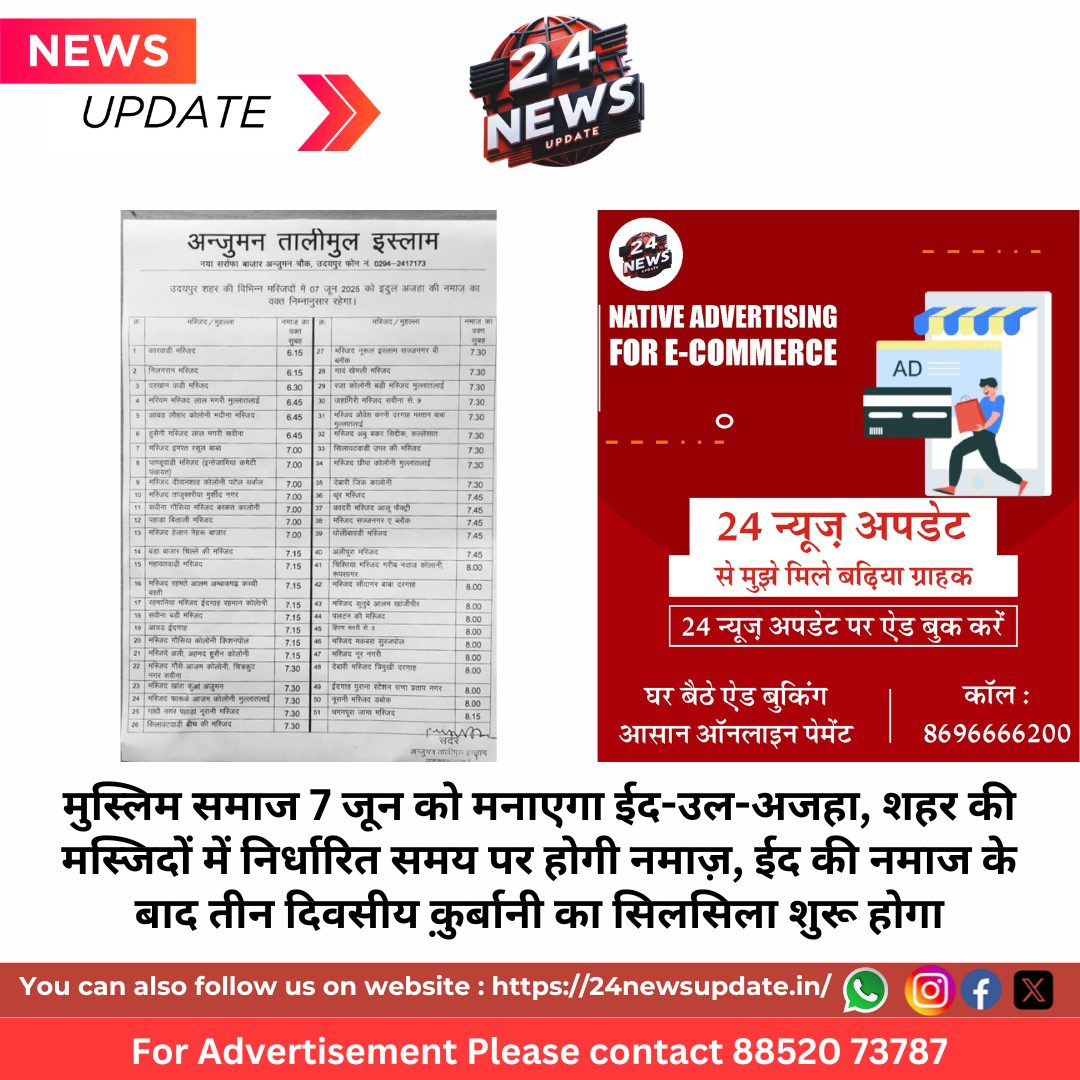 24 News Update उदयपुर। अंजुमन तालीमुल इस्लाम, उदयपुर के अनुसार मुस्लिम समाज आगामी शनिवार 7 जून 2025 को ईद-उल-अजहा (बकरीद) का पर्व पूरे धार्मिक उत्साह, आपसी सौहार्द और भाईचारे के साथ मनाएगा। इस मौके पर शहर की विभिन्न मस्जिदों में सुबह 6ः15 बजे से 8ः15 बजे तक ईद की नमाज अदा की जाएगी। नमाज के बाद मुस्लिम समाज 7, 8 और 9 जून तक क़ुर्बानी की रस्म अदा करेगा। अंजुमन के मोहसिन हैदर ने बताया कि हर वर्ष की भांति इस बार भी उदयपुर की तमाम मस्जिदों में ईद की विशेष नमाज निर्धारित समय अनुसार अदा की जाएगी। समाज के सभी लोगों से शांतिपूर्वक और अनुशासित तरीके से त्यौहार मनाने की अपील की गई है।