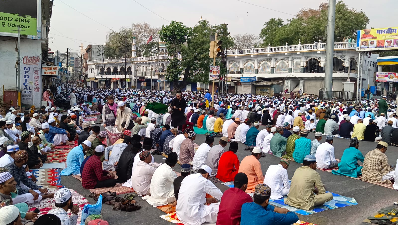 उदयपुर। ईद उल फित्र खुशियों का पैगाम लेकर आया। रमजान के पाक महीने के बाद आज जब उदयपुर में चेतक सर्कल स्थित पलटन मस्जिद सहित अन्य मस्जिदों में ईद की नमाज के बाद सबने एक दूसरे के गले मिल कर भाईचारे का संदेश दिया। नमाज के दौरान सबने देश की उन्नति व अमन चैन के लिए दुआ मांगी। इस अवसर पर समाज के लोगों में खासा उत्साह देखने को मिल रहा हैं छोटे बच्चे से लेकर बड़े और बुजुर्ग तक बडी संख्या में चेतक सर्कल ईदगाह पहुंचे वएक-दूसरे से गले मिलकर मुबारकबाद दी। मौके पर मौजूद एसपी और जिला कलेक्टर ने भी सबको मुबारकबाद दी। अन्जुमन तालीमुल इस्लाम के सदर मुजीब सिद्दीकी और सेक्रेटरी आबिद खान पठान ने बताया कि शहरभर की प्रमुख मस्जिदों में नमाज अदा की गई। अलग-अलग मस्जिदों में अलग-अलग समय पर नमाज अदा की गई। उदयपुर में मस्जिद दरगाह इमरत रसूल बाबा, मस्जिद महावत वाड़ी, मस्जिद गंज शहिदा अंबावगढ़ दरगाह, रजा मस्जिद दरखानवाड़ी, मस्जिद गौसे आजम कॉलोनी चित्रकूट नगर, मोहम्मदी मस्जिद पटेल सर्किल, मस्जिद हेलान, मस्जिद ए गौसिया छोटी मस्जिद बरकत कॉलोनी सवीना, बड़ी मस्जिद सवीना, बड़ा बाजार चिल्ले की मस्जिद, मस्जिद खारा कुआं, मस्जिद रहमते आलम कच्ची बस्ती अंबावगढ़, मरियम मस्जिद लाल मंगरी, मस्जिद मुर्शीद नगर सवीना, जहांगिरी मस्जिद, पांडुवाडी मस्जिद, बड़ी मस्जिद मुल्ला तलाई, मस्जिद ए अली अहमद हुसैन कॉलोनी मल्लातलाई, बिलाली मस्जिद पहाड़ा, गोसिया मस्जिद किशनपोल सहित अन्य मस्जिदों में नमाज अदा की गई। इधर मुस्लिम मोहल्लों में भी खासी रौनक है। बच्चों के झूले व चकरी डोलर लगे हैं जिन पर बच्चे आनंद ले रहे हैं। इसके अलावा कई जगह सामूहिक भोज कर ईद की खुशियों बांटी जा रही है।
