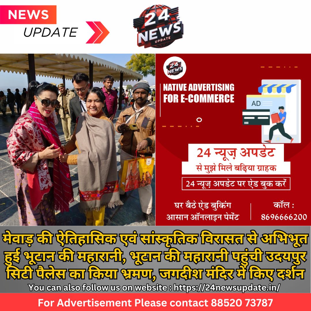 24 न्यूज़ अपडेट उदयपुर। भूटान की महारानी (र्ह मजेस्टी) आशी शेरिंग यांगदोएन वांग्चुक गुरूवार को दो दिवसीय प्रवास पर उदयपुर पहुंची। उपनिदेशक पर्यटन शिखा सक्सेना ने बताया कि उदयपुर आगमन पर भूटान की महारानी और उनके दल का मेवाड़ी परंपरा के तहत स्वागत किया गया। सिटी पैलेस में क्रिस्टल गैलेरी का अवलोकन किया। इस दौरान मेवाड़ की सांस्कृतिक और ऐतिहासिक विरासत से रूबरू होते हुए काफी अभिभूत नजर आई। उन्होंने जगदीश मंदिर पहुंच कर दर्शन किए। इस दौरान उन्होंने वहां चल रहे भजन-कीर्तन को भी काफी देर तक सुना तथा प्रसन्नता व्यक्त की। मंदिर के पुजारी ने उनका बहुमान किया। उन्होंने जगदीश चौक क्षेत्र के बाजार का अवलोकन कर हस्तशिल्प से जुड़ी सामग्री को निहारा। Share this: Share on X (Opens in new window) X Share on Facebook (Opens in new window) Facebook More Email a link to a friend (Opens in new window) Email Share on WhatsApp (Opens in new window) WhatsApp Like this:Like Loading... Related Discover more from 24 News Update Subscribe to get the latest posts sent to your email. Type your email… Subscribe Post navigation सुविवि में 6 साल बाद फिर ‘‘सूटा-आउट’’ से भूचाल, शिक्षकों ने कहा यह अन्याय उदयपुर बर्ड फेस्टिवल के 11वें संस्करण का गोल्डन पार्क में शुभारंभ