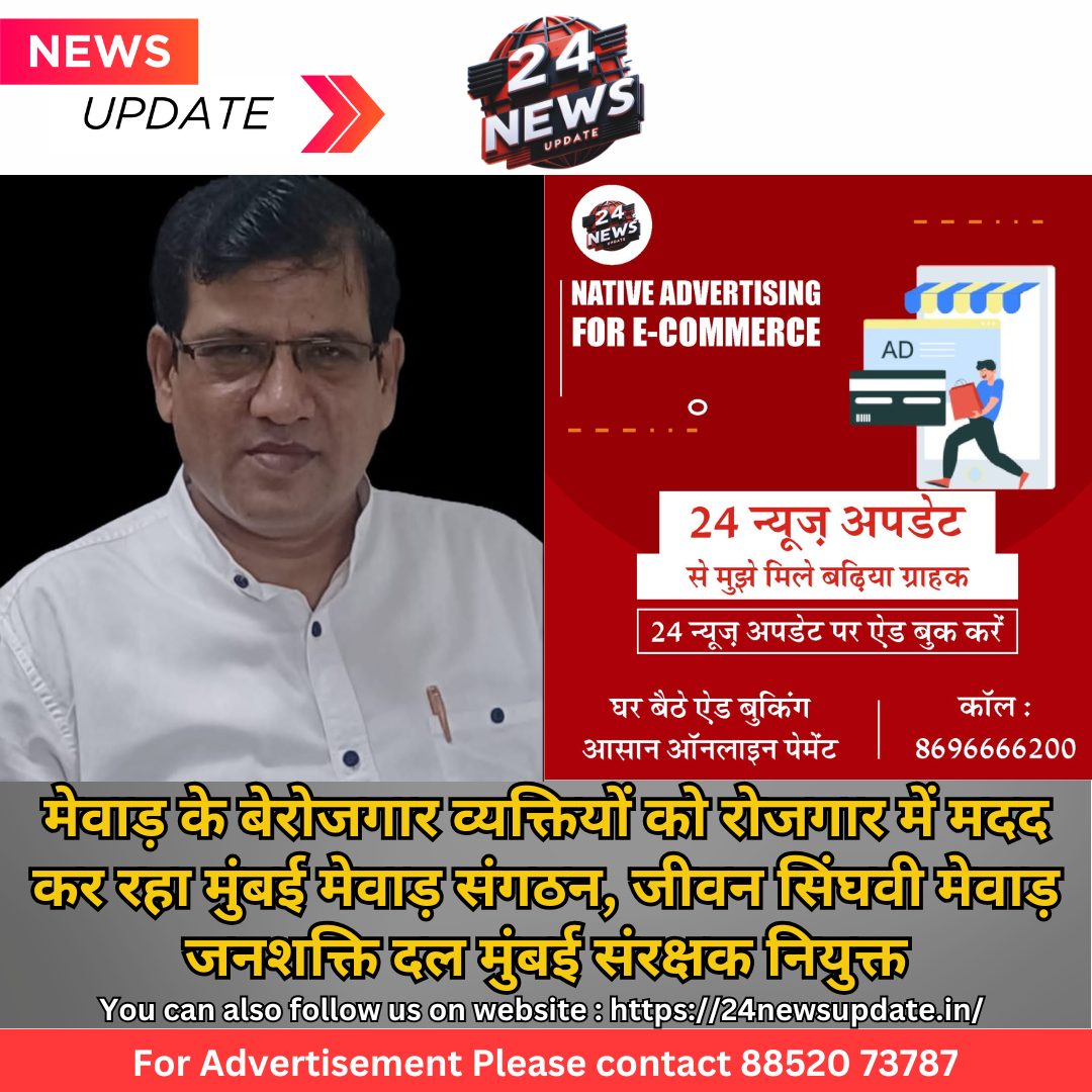 24 न्यूज़ अपडेट उदयपुर. मेवाड़ जनशक्ति दल राष्ट्रीय संगठन ने मेवाड़ के बाद युवाओं का रोजगार देने और सक्षम बनाने का जो जिम्मा संगठन के माध्यम से उठाया है उसी को देखते हुए महाराष्ट्र मेवाड़ संगठन के अध्यक्ष जीवन सिंघवी को मेवाड़ जनशक्ति दल प्रमुख नरेश कुमार शर्मा ने संगठन का संरक्षक नियुक्त किया सिंघवी ने बताया कि मेवाड़ के रहने वाले प्रत्येक व्यक्ति का जो महाराष्ट्र में रहते हुए व्यवसाय करता है या रोजगार के लिए आता है उसको मेवाड़ जनशक्ति दल के माध्यम से उचित व्यवस्था करवा कर रोजगार दिया जाएगा और हर तरह की मदद की जाएगी यह जानकारी संभाग संगठन मंत्री ऋत्विक चौबीसा ने दी। Share this: Share on X (Opens in new window) X Share on Facebook (Opens in new window) Facebook More Email a link to a friend (Opens in new window) Email Share on WhatsApp (Opens in new window) WhatsApp Like this:Like Loading... Related Discover more from 24 News Update Subscribe to get the latest posts sent to your email. Type your email… Subscribe Post navigation 118वां बिजय कुमार सुराणा स्मृति चिकित्सा शिविर 19 जनवरी को विज्ञान समिति अशोकनगर मे आयोजित होगा: सेवा विस्तार में अब शिशु रोग विशेषज्ञ डा. वनिला जैन भी रहेंगी उपलब्ध स्वच्छता जागरूकता के लिए दो साइकिलिस्ट का अनूठा प्रयास, इंडिया गेट से गेटवे ऑफ इंडिया तक की साइकिल यात्रा में देंगे स्वच्छता का संदेश, साइकिल पर 1447 किलोमीटर का संदेशपरक सफर