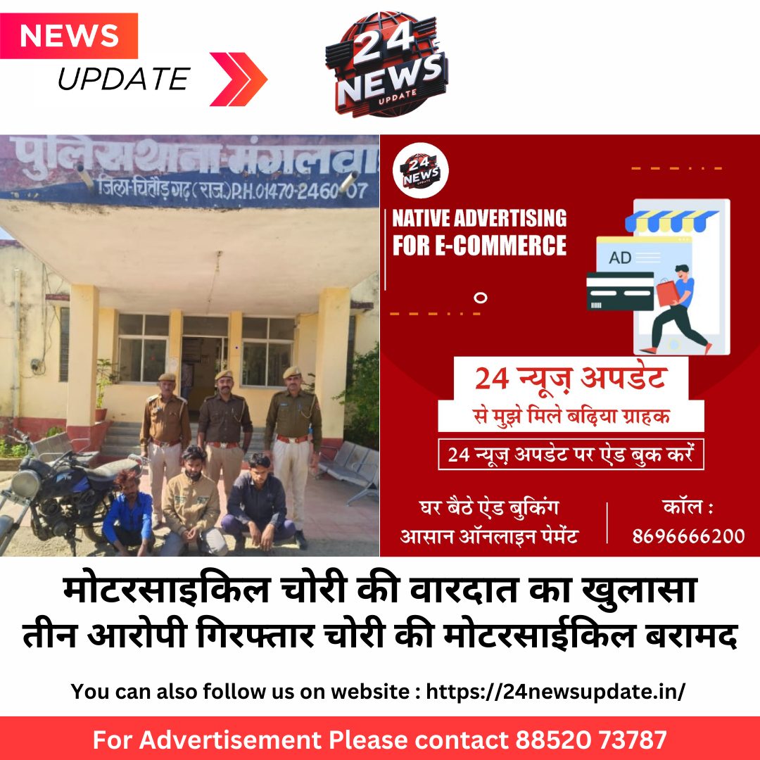 24 न्यूज़ अपडेट चित्तौड़गढ़। मंगलवाड़ थाना पुलिस ने गैरेज से मोटरसाइकिल चोरी करने की वारदात का खुलासा करते हुए तीन आरोपियों को गिरफ्तार किया है। चोरी की गई मोटरसाइकिल भी बरामद ।पुलिस अधीक्षक श्री सुधीर जोशी ने बताया दिनांक 01 फरवरी 2025 को प्रार्थी उदयलाल जाट निवासी तितरडा थाना मंगलवाड द्वारा रिपोर्ट पेश की कि प्रार्थी की दुकान देव ऑटो गेराज एवं सर्विस सेन्टर पर खडी ग्राहक की टीवीएस मोटरसाईकिल को अज्ञात चोर चोरी कर ले गये उक्त रिपोर्ट पर प्रकरण पंजीबद्ध किया जाकर अतिरिक्त पुलिस अधीक्षक चित्तौड़गढ़ सरितासिंह के निर्देशन में व पुलिस उप अधीक्षक वृत बडीसादडी देशराज कुलदीप के सुपरविजन में भगवानलाल थानाधिकारी पुलिस थाना मंगलवाड द्वारा एएसआई प्रेमनाथ मय जाप्ता की टीम गठित की गई टीम द्वारा आसुचना संकलन कर चोरी का पर्दाफाश कर मोटरसाईकिल चोरी करने वाले 01. मकना पिता कोदरिया जाति ढाबी उम्र 31 वर्ष निवासी चरपोटा थाना पाटन जिला बांसवाडा, 02. फारूख पिता गफार मोहम्मद जाति मुसलमान उम्र 30 वर्ष निवासी मंगलवाड चौराहा थाना मंगलवाड जिला चित्तौडगढ़ तथा उक्त चोरी की गई मोटरसाईकिल को खरीदने वाले 03. तौसिफ अंसारी पिता असफाक अंसारी जाति मुसलमान उम्र 21 वर्ष निवासी राव मोहल्ला मंगलवाड थाना मंगलवाड जिला चित्तौडगढ को गिरफ्तार कर माल मसरूका मोटरसाईकिल को बरामद किया गया।पुलिस टीमः- थानाधिकारी भगवानलाल ,एएसआई प्रेमनाथ कानि गोमाराम(विशेष योगदान), टंवरसिंह , उम्मेदसिंह गजेन्द्रसिंह Share this: Share on X (Opens in new window) X Share on Facebook (Opens in new window) Facebook More Email a link to a friend (Opens in new window) Email Share on WhatsApp (Opens in new window) WhatsApp Like this:Like Loading... Related Discover more from 24 News Update Subscribe to get the latest posts sent to your email. Type your email… Subscribe Post navigation 22 किलो 860 ग्राम अवैध अफीम डोडाचूरा जब्त, दो आरोपी गिरफतार अनगढ बावजी मन्दिर में चोरी करने वाले तीन अभियुक्त गिरफ्तार, लोहे की एंगल बरामद