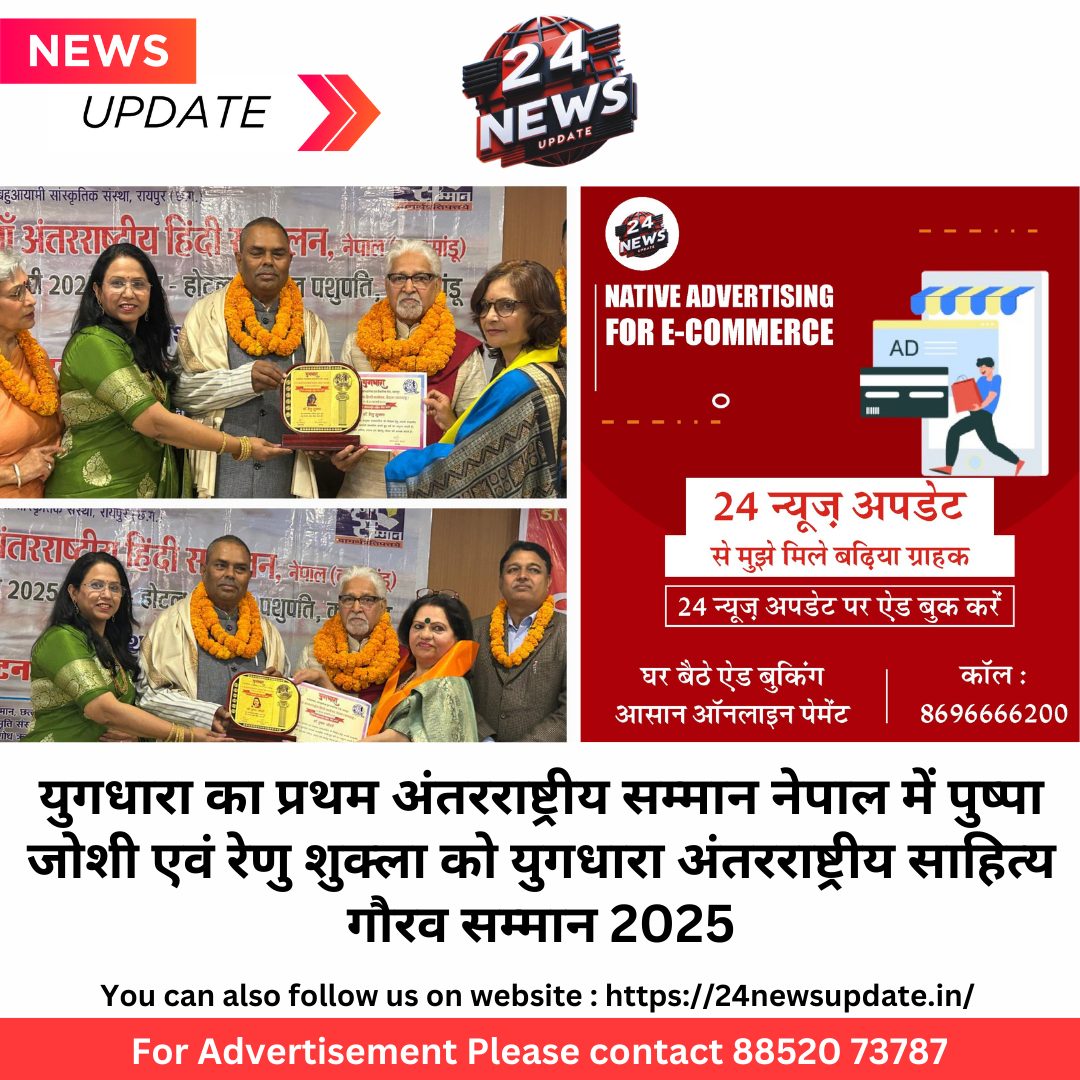 24 न्यूज़ अपडेट उदयपुर, 5 मार्च । युगधारा साहित्यिक सांस्कृतिक एवं वैचारिक मंच द्वारा वैश्विक स्तर पर साहित्य सृजन एवं हिंदी के प्रचार-प्रसार हेतु युगधारा अंतरराष्ट्रीय साहित्य गौरव सम्मान 2025 काठमांडू, नेपाल में हुए 24वें अंतरराष्ट्रीय हिंदी सम्मेलन में दो सृजन धर्मियों को प्रदान किया गया। युगधारा के संस्थापक ज्योतिपुंज ने बताया कि ट्रू मीडिया दिल्ली की सहसंपादक वरिष्ठ साहित्यकार डॉ पुष्पा जोशी एवं विश्वविद्यालय देहरादून की व्याख्याता वरिष्ठ साहित्यकार, इतिहासकार डॉ रेणु शुक्ला को युगधारा का यह प्रथम अंतरराष्ट्रीय साहित्य गौरव सम्मान 2025 प्रदान किया गया। यह सम्मेलन सृजन सम्मान बहुआयामी साहित्यिक एवं सांस्कृतिक संस्था रायपुर, छत्तीसगढ़ के तत्वावधान में आयोजित किया गया। सृजन सम्मान संस्था के समन्वयक जयप्रकाश मानस ने बताया कि इस कार्यक्रम के मुख्य अतिथि नेपाल के पूर्व उप प्रधानमंत्री उपेंद्र यादव थे। अध्यक्षता अंबिका दत्त चतुर्वेदी ने की, विशिष्ट अतिथि नेपाल के साहित्यकार भीष्म उप्रेती रहे एवं सम्मेलन की अध्यक्ष डॉ सविता मोहन मंच पर उपस्थित रही। मंच पर डॉ मंगला रानी, डॉ सुनीति आचार्य, कृष्ण कुमार प्रजापति एवं नेपाल के साहित्यकार चंद्र प्रकाश उपाध्याय भी मंच पर विराजित रहे। सृजन सम्मान के समन्वयक जयप्रकाश मानस ने बताया कि युगधारा का यह सम्मान इस संस्था से प्रदान किया जाना अत्यंत हर्ष का विषय है। युगधारा अध्यक्ष किरण बाला ‘किरन’ जो कि अंतरराष्ट्रीय सम्मेलन की संचालक एवं अकादमिक प्रमुख हैं, इनके प्रयासों से यह संभव हो पाया कि विदेश की धरती पर युगधारा की अजस्र धारा प्रवाहित हो रही है। सम्मान प्राप्त करने वाली दोनों साहित्यकार अपने क्षेत्र की उत्कृष्ट रचनाकार हैं। कई वैदेशिक मंचों पर पर सक्रियता से अपनी भूमिका का निर्वहन करती हैं। इनके कई शोध पत्र प्रकाशित है एवं कई सम्मानों से सम्मानित है।