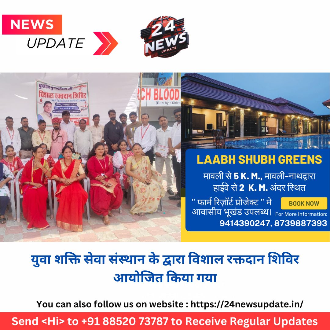24 न्यूज़ अपडेट शाहपुरा. जयपुर युवा शक्ति सेवा संस्थान के द्वारा विशाल रक्तदान शिविर आयोजित किया गया जिसमें संस्थापक युवराज मुण्डोतिया के जन्मदिन पर यह आयोजन किया गया जिसमें युवराज मुण्डोतिया के द्वारा गायो को चारा पानी कि व्यवस्था कि गई साथ ही पंछियों को दाना पानी कि व्यवस्था कि गई व आंगनबाड़ी केंद्र पर बच्चों को मिठाई व फल वितरण किया गया इस मोके पर मुख्य अतिथि नरेश गोयल, अनिल शास्त्री,कमल कंसल , युवराज विशिष्ट रहे अतिथि कमलेश कुमार, युवराज विशिष्ट व क्षैत्रीय पार्षद धमेंद्र आलोरिया ,मदन लाल, रहे एवं संस्थान के संरक्षक सुरेन्द्र जोशी रहे जिस पर राष्ट्रीय उपाध्यक्ष मेघराज मोर्य, राष्ट्रीय महासचिव राजेंद्र कुमार कुलदीप, राष्ट्रीय राजेंद्र कुमार कुलदीप, राष्ट्रीय सचिव महेन्द्र कुमार दूड़िया, मिडिया प्रभारी रामफूल राणा, कम्प्यूटर आपरेटर विनोद गोयल,विधि सलाहकार छवि चतुर्वेदी, प्रदेश महासचिव जितेन्द्र मुण्डोतिया प्रदेश सचिव मुकेश कुमार मीणा, प्रदेश महासचिव अनिल मुण्डोतिया जिला महासचिव दिव्या कराडिया जिला सचिव सन्तोष बैरवा ,जिला सचिव सुशीला देवी , वार्ड अध्यक्ष चन्द्र प्रकाश मोर्य उपाध्यक्ष दिनेश परेवा वार्ड अध्यक्ष मीनू भाटिया, उपाध्यक्ष विंध्या देवी, दिनेश नायक, वार्ड उपाध्यक्ष आशा बैरवा किरण, वार्ड अध्यक्ष विभा देवी, सुरेश प्रजापत, अशोक ,नीशा देवी,पुजा देवी व संस्थान के सभी पदाधिकारी मौजूद रहे