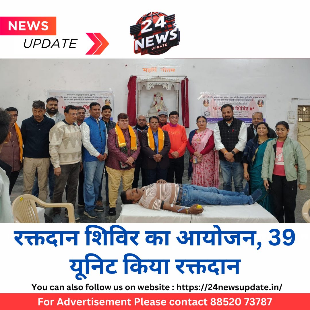 24 न्यूज़ अपडेट उदयपुर. समस्त गुर्जर गौड़ ब्राह्मण समाज, श्री गुर्जर गौड़ ब्राह्मण सभा संस्था हिरण मगरी, ट्रस्ट श्री गौतमेशवर गुर्जर गौड़ ब्राह्मण समाज, रक्त दाता युवा वाहिनी भारत विकास परिषद मेवाड़ एवं श्री गुर्जर गौड़ ब्राह्मण विकास समिति के संयुक्त तत्वावधान में रविवार 12 जनवरी 2025, युवा दिवस, स्वामी विवेकानन्द जयंती पर रक्त दान शिविर का आयोजन महर्षि गौतम भवन में किया गया। इस शिविर में 39 लोगों ने रक्तदान किया। शिविर में गोपेश शर्मा, शिव शंकर पालीवाल, निलेश पालीवाल का सहयोग रहा। वृक्षम अमृतम संस्था द्वारा सभी रक्त दाताओं को तुलसी का पौधा वितरित किया।कार्यक्रम संयोजक मनीष तिवारी ने बताया कि रक्तदान शिविर का उद्धाटन समाजसेवी एवं आलोक संस्थान निदेशक डॉ प्रदीप कुमावत, डॉ जयराज आचार्य, रंजन राज आचार्य, प्रभाष शांडिल्य, नरेंद्र पालीवाल, संजीव भारद्वाज, हरिशंकर तिवारी, चंद्र कांत पालीवाल द्वारा किया गया।इस रक्तदान शिविर में युवाओं, महिलाओं ने पूरे जोश और उत्साह से भाग लिया। इस शिविर में समाज अध्यक्ष राकेश जोशी, पार्षद देवेन्द्र पुजारी, गोपेश शर्मा, रघुवीर व्यास, कपिल शर्मा, मनीष व्यास, संजय शर्मा , विनोद त्रिपाठी, पंकज जैन, सुरेश पालीवाल, मुकेश मोड़, हृद यांश तिवारी,प्रभात रंजन शर्मा, संदीप व्यास, राजकुमार शर्मा, दिलीप त्रिपाठी, अवनीश व्यास रमाकांत शर्मा, राजेश शर्मा अश्विनी जोशी, भावना तिवारी, संगीता आचार्य, प्रीति उपाध्याय,नवनीता व्यास, पूनम उपाध्याय, हिमाक्षी व्यास सहित पूरी रक्तदाता युवा वाहिनी टीम का विशेष सहयोग रहा।शिविर में डॉ कैलाश के नेतृत्व में महाराणा भूपाल चिकित्सालय ब्लड बैंक की टीम का सम्मान किया गया।
