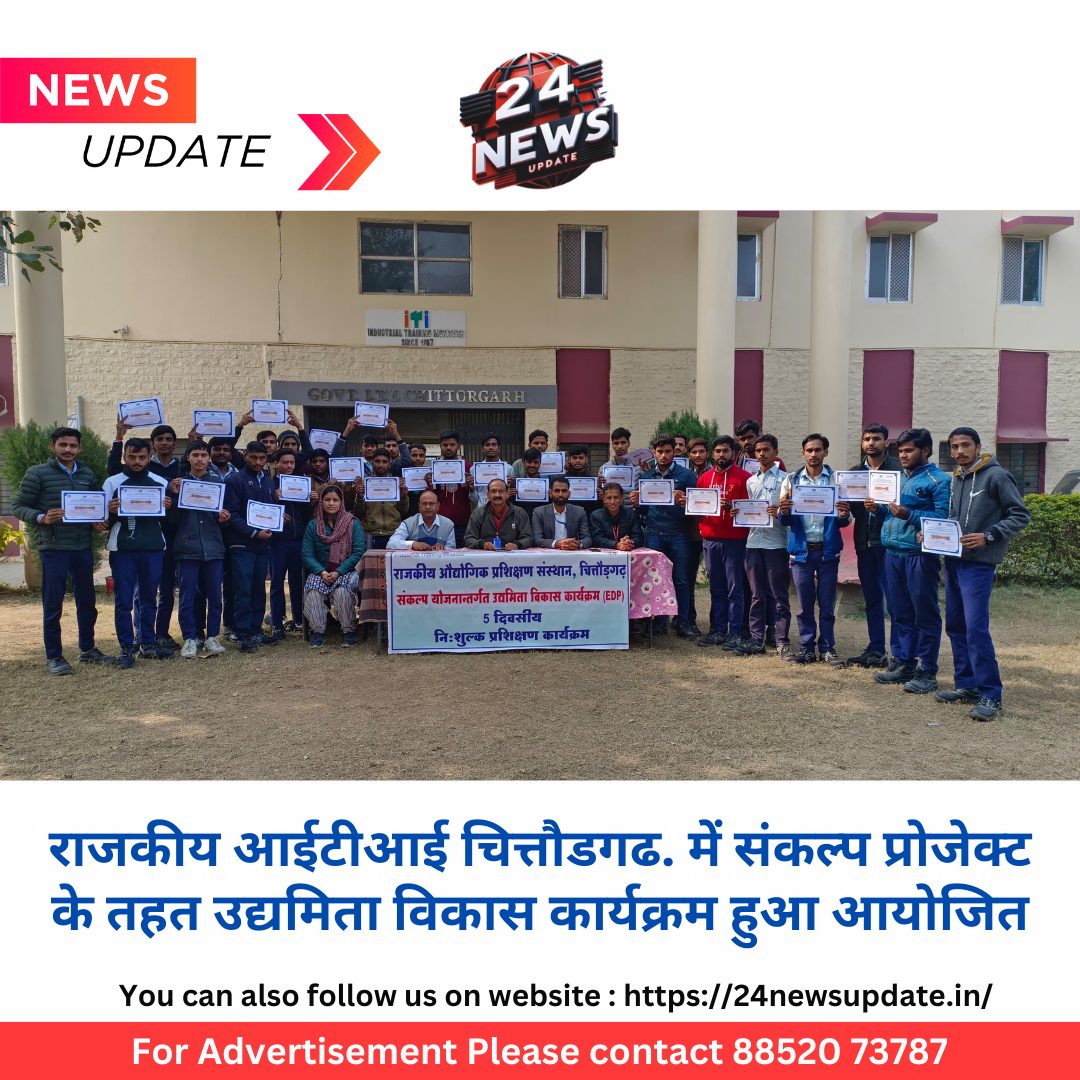 24 न्यूज़ अपडेट चित्तौडगढ। राजकीय औद्योगिक प्रशिक्षण संस्थान चित्तौडगढ. में संकल्प प्रोजेक्ट के तहत उद्यमिता विकास कार्यक्रम 17 दिसम्बर 2024 से 21 दिसम्बर 2024 तक आयोजित किया गया। जिसमें 30 प्रशिक्षणार्थियो का चयन कर विभिन्न सन्दर्भ व्यक्तियों विष्णु अग्रवाल बैंक ऑफ बडौदा, मोहित सिंह शेखावत उद्योग विभाग, श्रीमति प्रिती वर्मा आर.एन. टी. कॉलेज, राज सिंह, राजेश भट्ट मेवाड विश्वविद्यालय एवं सुनील भण्डारी, सी.ए. द्वारा प्रतिदिन कार्यक्रम की विविध जानकारी प्रदान की गई। कार्यक्रम के अन्तिम दिवस में 30 प्रशिक्षणार्थियों को संस्थान के उपनिदेशक राजकुमार बागोरा, सुरेन्द्र कुमार प्रजापति, जिला कौशल समन्वयक, आरएसएलडीसी एवं विष्णु शर्मा, अधीक्षक औ.प्र.सं. गंगरार ने प्रमाण पत्र वितरित कर उनके उज्जवल भविष्य की कामना की गई। कार्यकम का संचालन वरिष्ठ अनुदेशक आदेश कुमार सोलंकी ने किया।