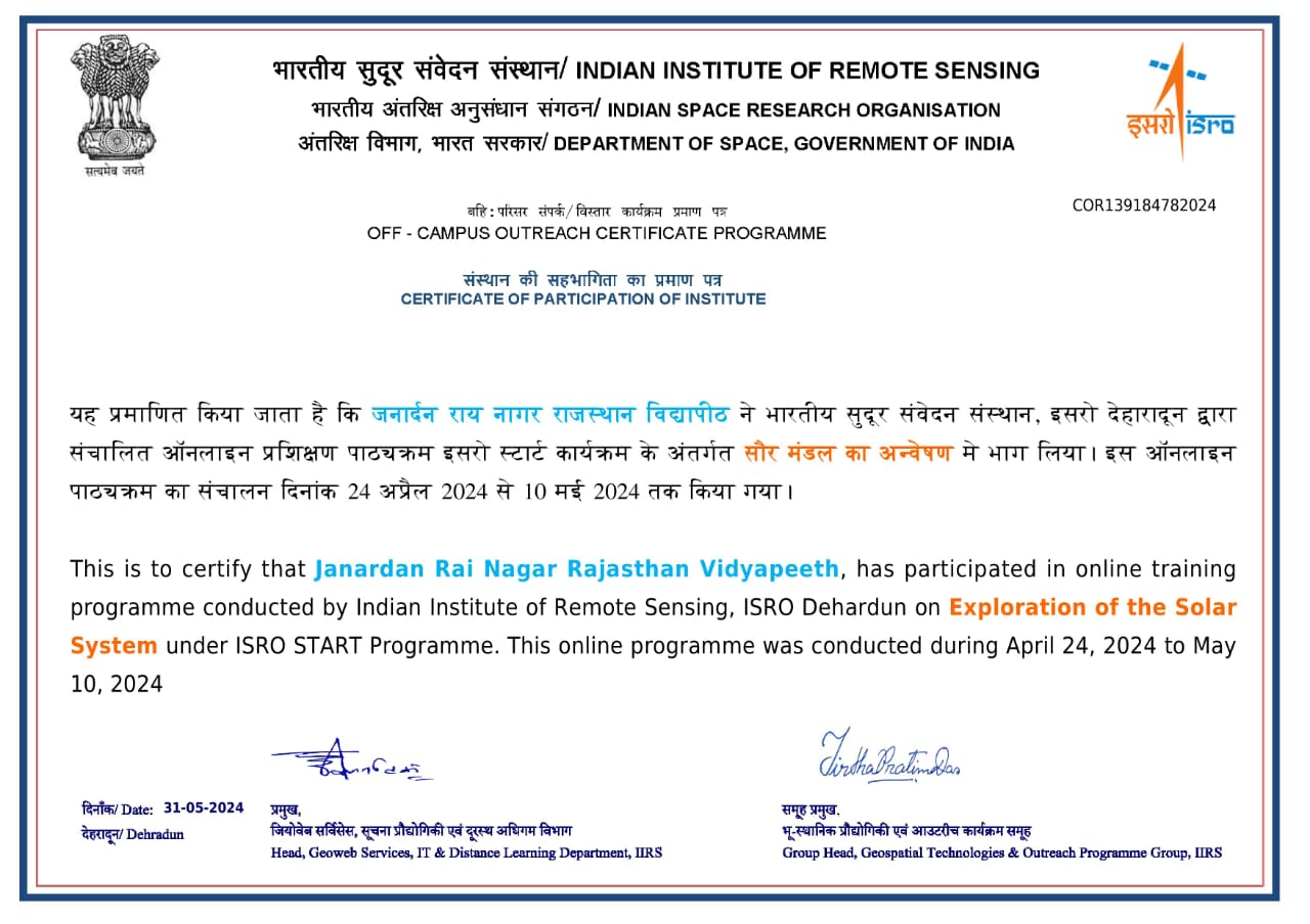 24 न्यूज अपडेट. उदयपुर। भारतीय अंतरिक्ष अनुसंधान संगठन (इसरो) के भारतीय सुदूर संवेदन संस्थान द्वारा संचालित ’सौर मंडल का अन्वेषण’ नामक ऑनलाइन प्रशिक्षण पाठ्यक्रम जनार्दन राय नागर राजस्थान विद्यापीठ द्वारा सफलतापूर्वक संचालित किया गया। कुलपति प्रो. एस.एस. सारंगदेवोत ने सफल प्रतिभागियों को बधाई देते हुए कहा कि इसरो द्वारा अंतरिक्ष विज्ञान के इस ऑनलाइन प्रशिक्षण में सौर मंडल अन्वेषण में नवीनतम खोजों, अंतरिक्ष मिशनों और तकनीकी प्रगति को कवर किया गया। इसरो के विशेषज्ञों’ द्वारा प्रतिभागियों को ग्रहों, चंद्रमाओं और अन्य खगोलीय पिंडों की व्यापक जानकारी प्रदान की गई। उन्होंने कहा कि सौरमंडल का अध्ययन करने से अनगिनत लाभ मिलते हैं। इस पाठ्यक्रम द्वारा हमारे विद्यार्थियों को सौरमंडल की गहरी समझ को बढ़ावा मिला है। इसरो के वैज्ञानिकों ने अगली पीढ़ी को प्रेरित किया है तथा अन्वेषण, समस्या-समाधान और मानव ज्ञान की सीमाओं को आगे बढ़ाने के जुनून को बढ़ावा दिया है। पाठ्यक्रम समन्वयक डॉ. चंद्रेश कुमार छतलानी ने बताया कि इसरो स्टार्ट के अंतर्गत या प्रशिक्षण मॉड्यूल 24 अप्रैल से 10 मई तक संपन्न हुआ। प्रशिक्षण व परीक्षा इसरो द्वारा ही ऑनलाइन संपन्न की गई। विद्यापीठ ने इसरो का यह दूसरा पाठ्यक्रम संचालित किया है, इससे पहले अंतरिक्ष विज्ञान और प्रौद्योगिकी जागरूकता पर ऑनलाइन पाठ्यक्रम को संपन्न किया गया था। विश्वविद्यालय को इसरो द्वारा इस हेतु एक प्रशंसा पत्र भी प्राप्त हुआ है। इस अवसर पर रजिस्ट्रार डॉ. तरुण श्रीमाली, डॉ. हेमंत साहू, निजी सचिव कृष्णकांत कुमावत, डॉ. ललित सालवी, विकास डांगी सहित विद्यापीठ के कार्यकर्ता उपस्थित थे।