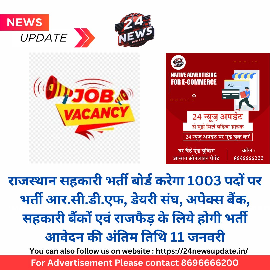 24 न्यूज़ अपडेट जयपुर। सहकारिता राज्य मंत्री (स्वतंत्र प्रभार) श्री गौतम कुमार दक ने शनिवार को बताया कि राजस्थान सहकार भर्ती बोर्ड के माध्यम से अपेक्स बैंक, जिला केन्द्रीय सहकारी बैंकों एवं राजफैड के 14 विभिन्न श्रेणियों में 498 पदों के लिए ऑनलाइन आवेदन की प्रक्रिया शुरू हो गई है। पात्र अभ्यर्थी 11 जनवरी 2025 तक आवेदन कर सकते है। उन्होंने बताया कि राजस्थान कोऑपरेटिव डेयरी फैडरेशन एवं जिला दुग्ध उत्पादक सहकारी संघों के 40 श्रेणियों में 505 पदों के लिये आवेदन की प्रक्रिया शीघ्र प्रारम्भ की जायेगी। दक ने बताया कि सहकार भर्ती बोर्ड भर्ती द्वारा आवेदन से लेकर परीक्षा सहित अंतिम परिणाम ऑनलाइन प्रक्रिया से संपादित किया जायेगा। चयन प्रक्रिया में पूरी पारदर्शिता एवं प्रामाणिकता को सुनिश्चित करने के लिये भर्ती बोर्ड द्वारा चयन प्रक्रिया को आईबीपीएस एजेन्सी के माध्यम से संपादित की किया जा रहा है। आईबीपीएस एजेन्सी देश की राष्ट्रीयकृत एवं ग्रामीण बैंकों के लिये विभिन्न ग्रेड के ऑफिसर्स के लिये भर्ती संबंधी कार्य को करती है।